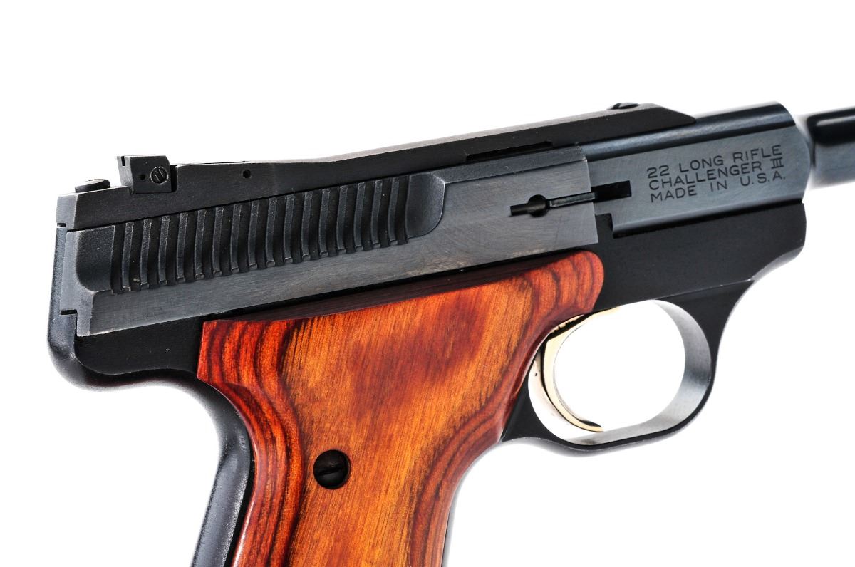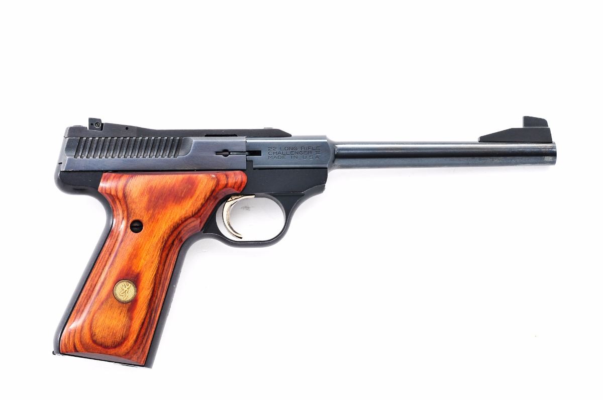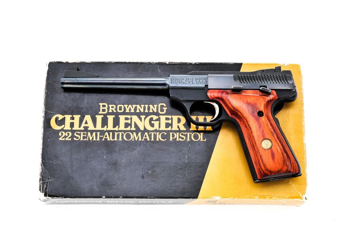 Browning Challenger III Sporter Semi-Automatic Pistol, #655PX28287, .22 LR cal., 6-3/4'' round barrel, blue finish, smooth laminated grips with inlaid Browning medallions, fixed front sight and notched adjustable rear sight, with one factory magazine. In correct type box with mismatched serial number and owner's manual. Condition is fine retaining approx. 96% blue. Left side of barrel with faint spotting, as well as light surface rust to left side of front sight. Grips with only a few minor marks from handling. Action and bore are excellent. Est.: $300-$450. (Modern/PPT)