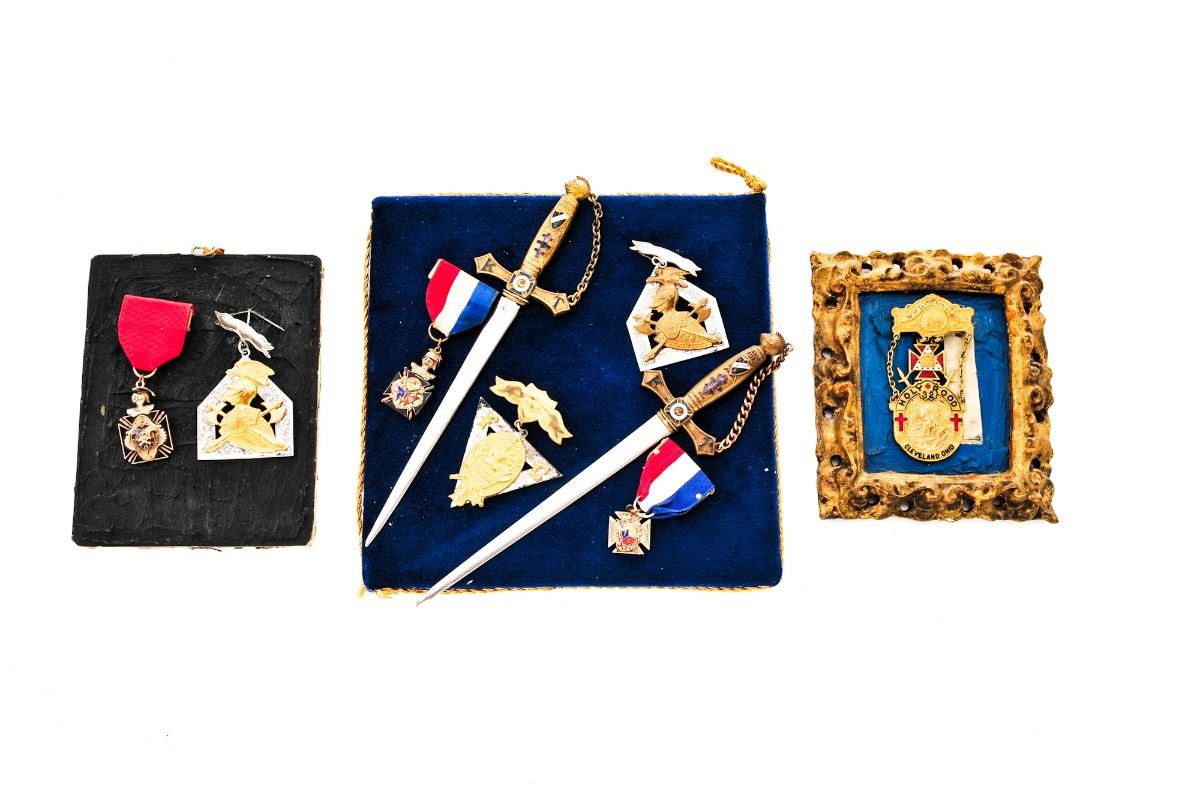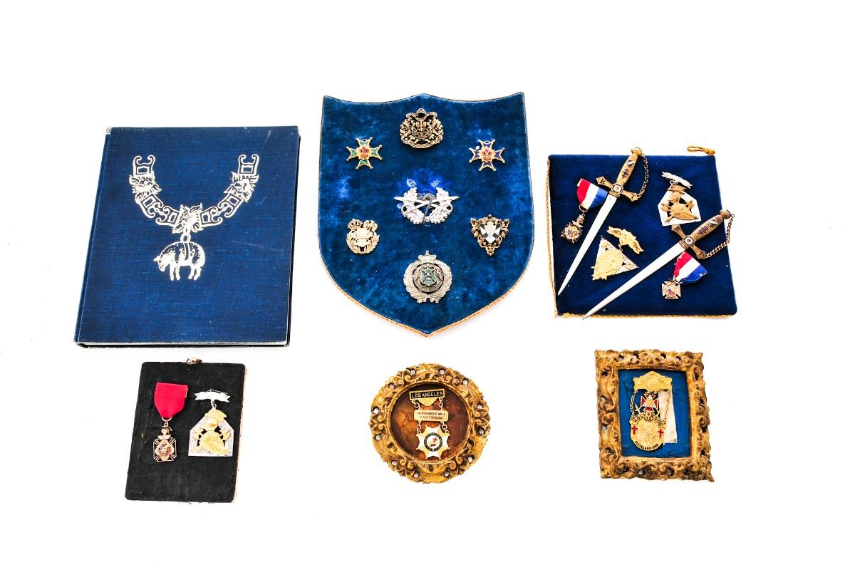 Estate Lot of Vintage Medals, Emblems & Awards: (1) Lot of three Knights Templar medals, marked ''FCB'', two with red/white/blue ribbons, and one ''Knights of Pythias'' medal with pin back. Mounted along with two miniature Knights Templar swords marked ''Colorado'' and dated 1913. (2) Lot of two Knights of Pythias medals, one with red ribbon. (3) Holy Rood 32, Cleveland, OH medal, named to Wm. Burgwald, maker marked on reverse ''Brunner Bros. Co., Cleveland, OH.'' (4) Los Angeles ''9'' Greater Order of Malta, St. Paul's Cathedral marked medal. (5) Seven various emblems from different fraternities, mounted on board. Along with the book ''Orders and Decorations'', by Paul Hamlyn, c. 1967. Condition to all medals is good, with discoloration, scuffs and minor loss of finish to some. Hardbound book shows wear at edges. Est.: $200-$300/lot.