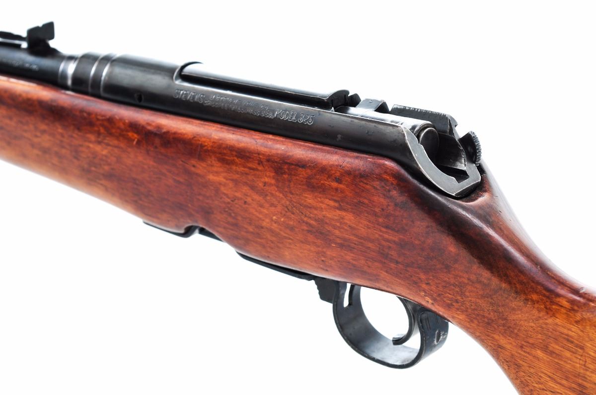 Stevens Model 325 Bolt Action Rifle, NVSN, .30-30 cal., 21'' barrel, blue finish, pistol-grip hardwood stock, Redhead rubber recoil pad, sling swivels, ramped brass bead front sight, notched rear sight with elevator, and one magazine. Condition is good retaining approx. 85%-90% toning blue, much of which shows an overall brown patina. Stock has been sanded and refinished. Recoil pad needs replacement/re-fitting. Action is crisp, bore is fine with nice rifling. Est.: $150-$300. (C&R)