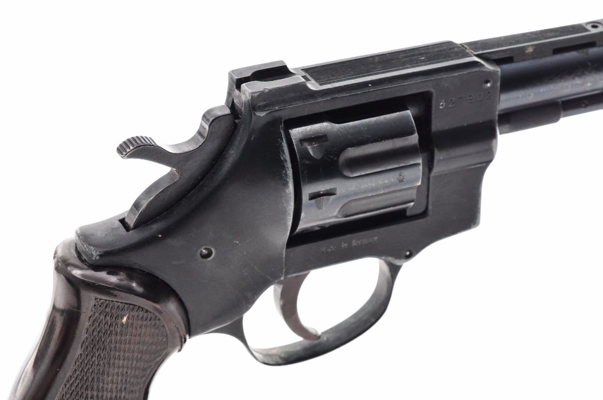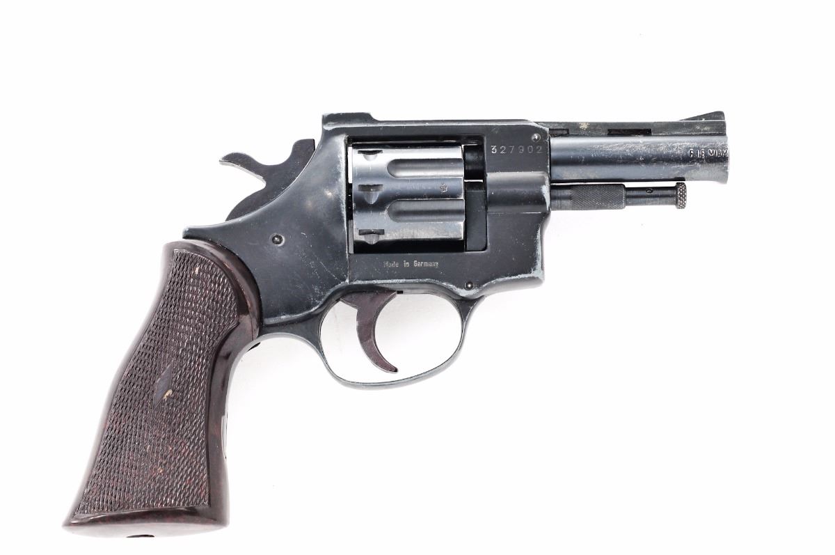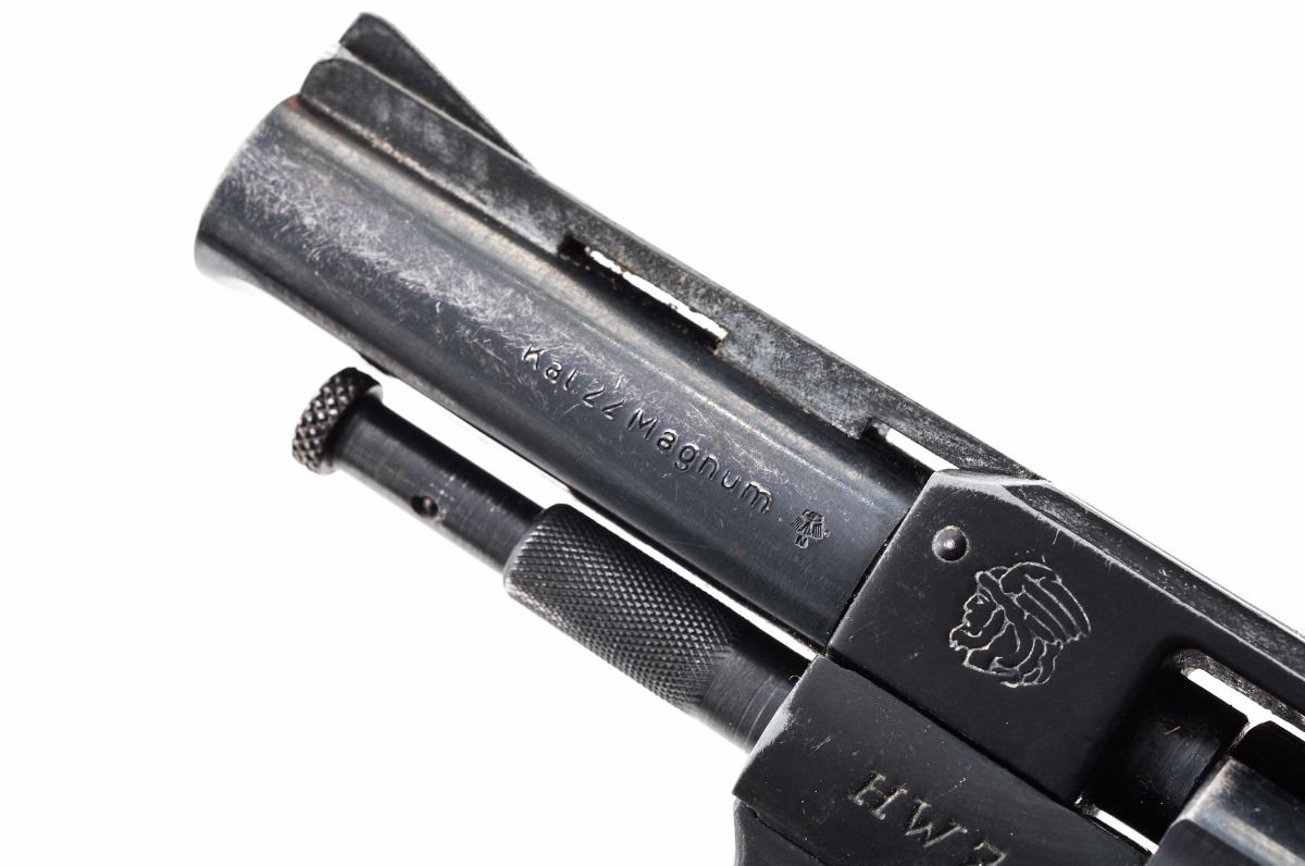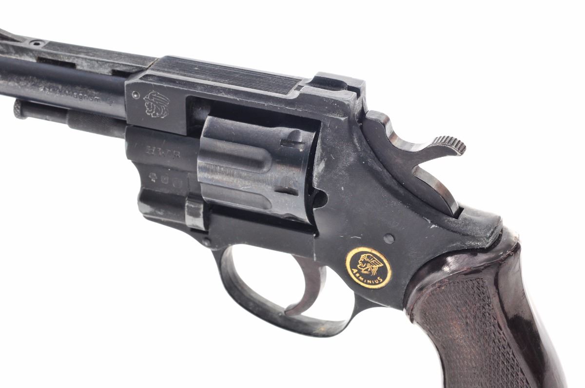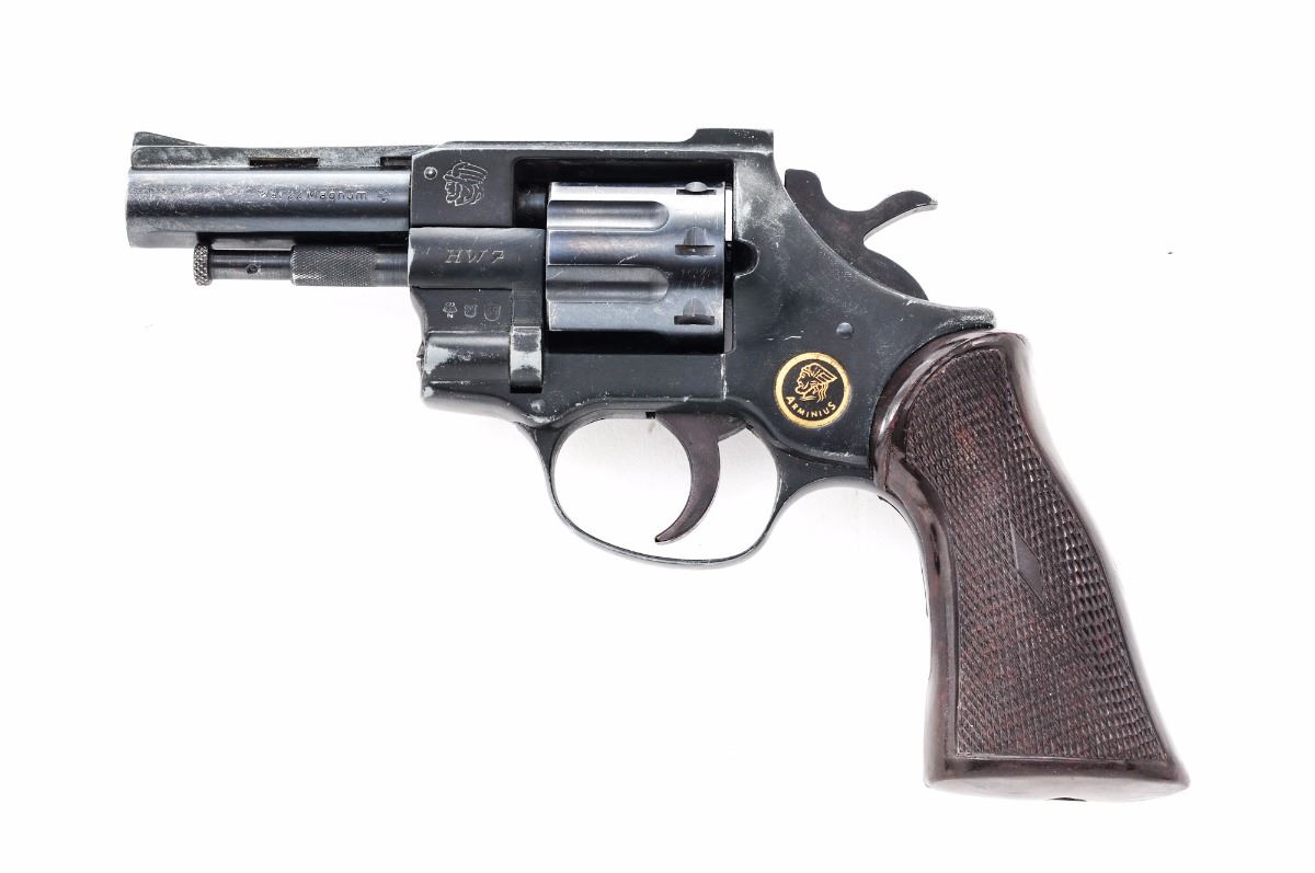 Arminius (F.I.E.) HW7 Double Action Revolver, #327902, .22 MRF cal., 3'' cutdown barrel, blue finish, checkered brown plastic grips, ramped blade front sight and frame channel rear sight. Import marked on barrel. Condition is good as modified with approx. 80% blue remaining on barrel and 75% black finish on frame. Grips are excellent. Action is tight, bore is bright. Est.: $75-$150. (Modern/PPT)