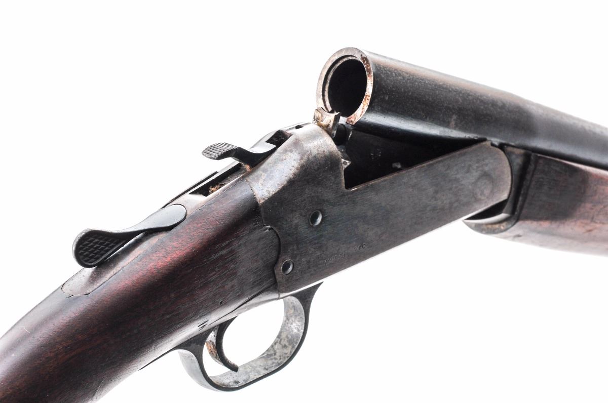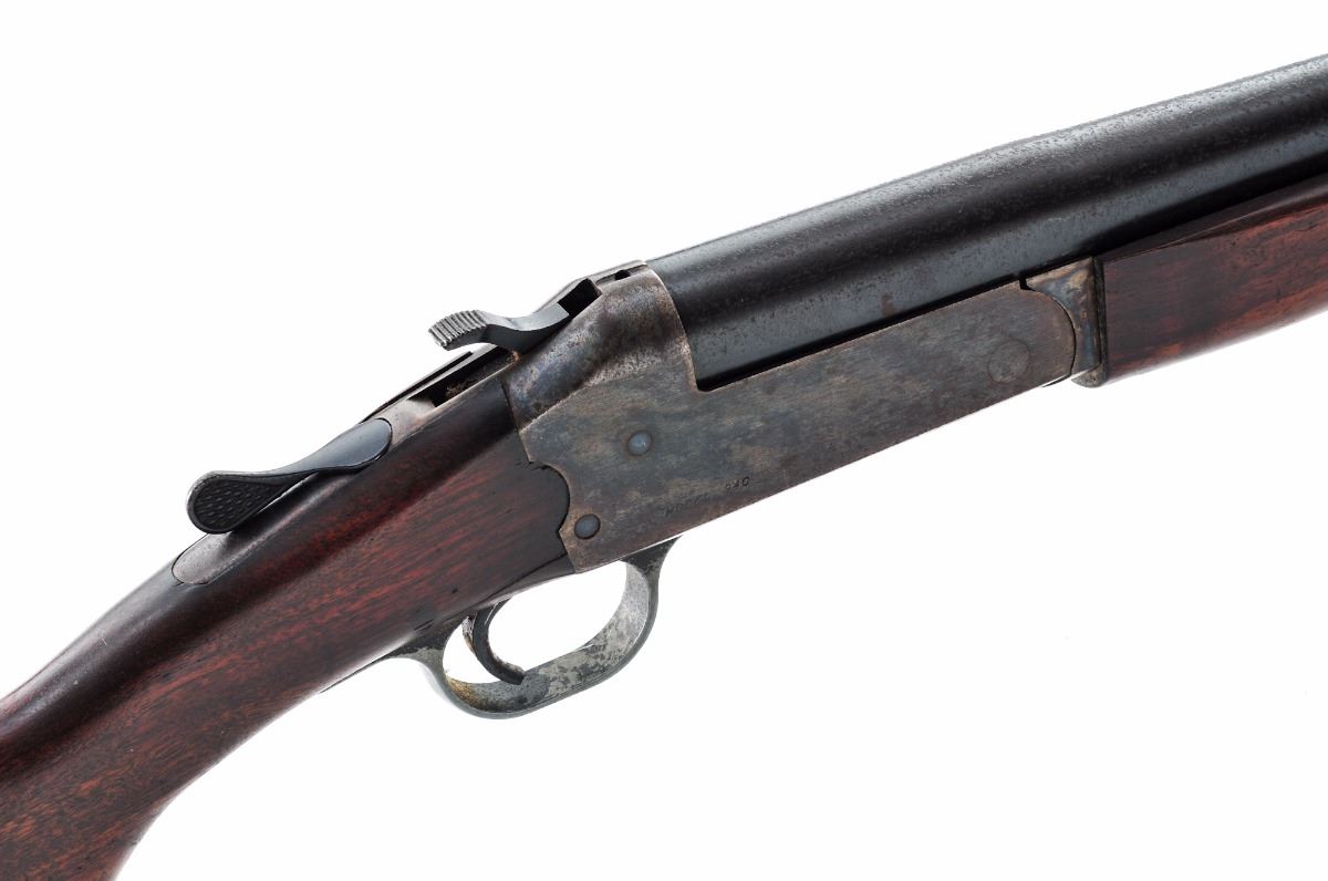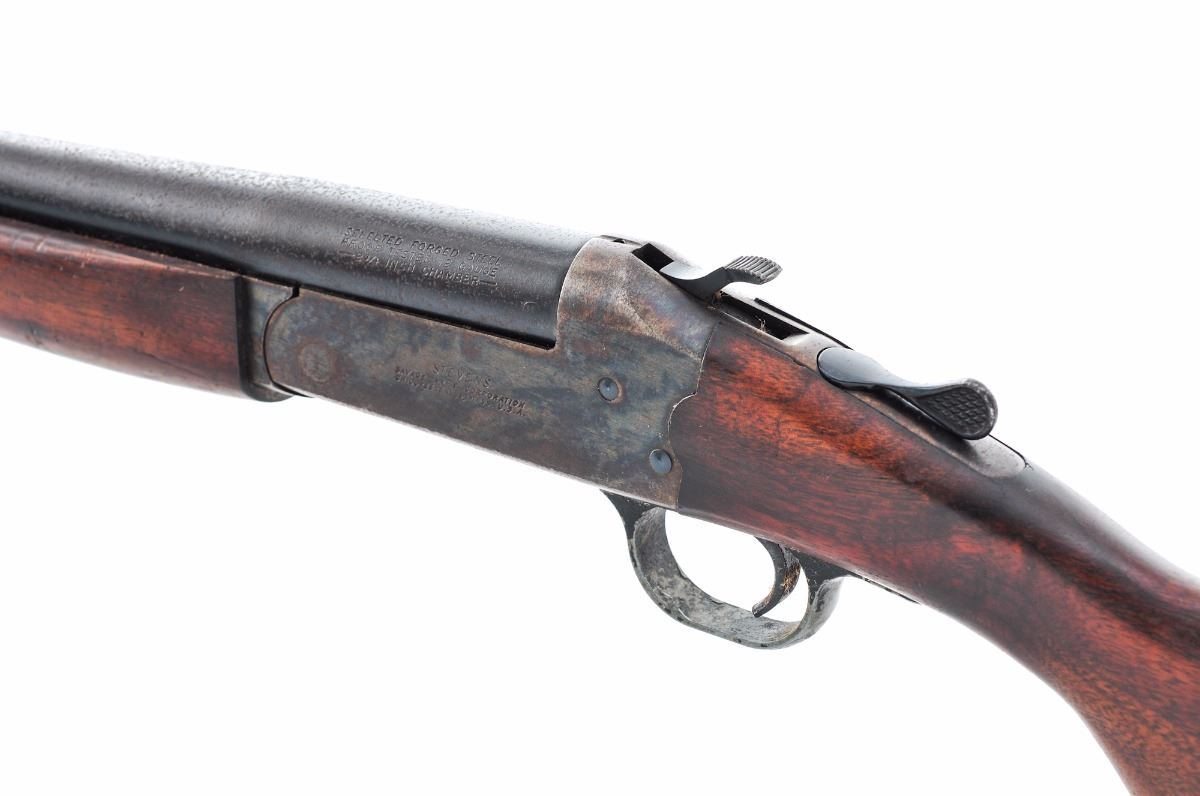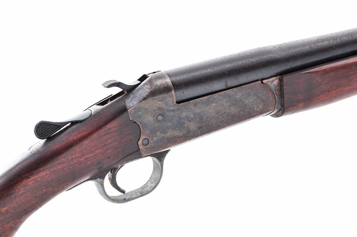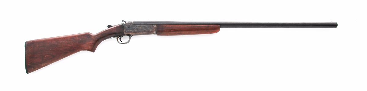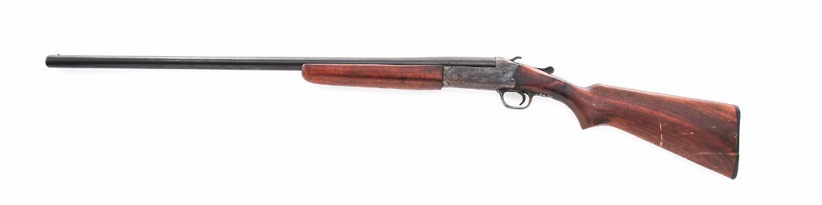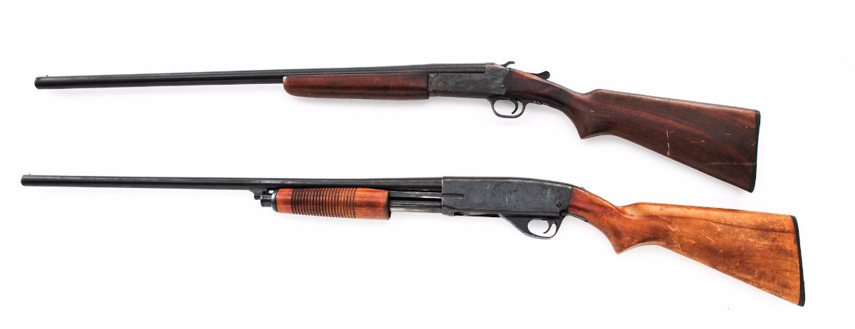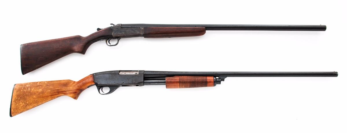 Lot of Two (2) Savage/Stevens Shotguns: (1) Stevens Model 94C Single Shot Shotgun, NVSN, 12 ga. chambered for 2-3/4'' shells, 30'' barrel, blue and case hardened finish, pistol-grip walnut stock and forend, black plastic buttplate, with silver bead front sight. Condition is fair. Metal surfaces with scattered surface rust. Stock and forend show oil darkening and wear, and one small repair near lower tang. Action is excellent and barrel remains tight to frame; bore is bright with the exception of a few patches of fine corrosion. (C&R) (2) Springfield/Savage Model 67 Series B Pump Action Shotgun, #A750872, 20 ga. chambered for 3'' shells, 28'' barrel, pistol-grip hardwood stock and grooved forend, with black plastic buttplate and silver bead front sight. Condition is fair. Metal surfaces with general surface rust. Stock with thinning to the finish, dings and mars. Action is crisp, bore is bright. (Modern) Condition to both guns would improve with a good cleaning. Est.: $150-$300/lot.