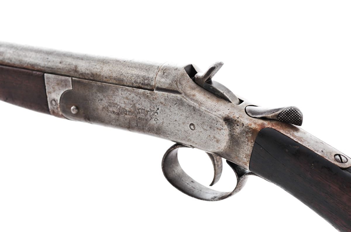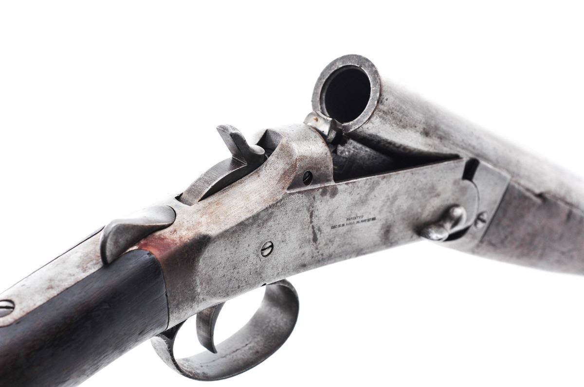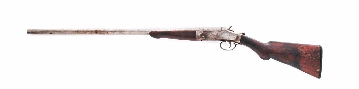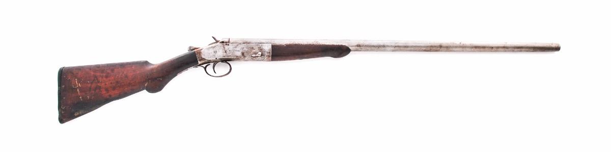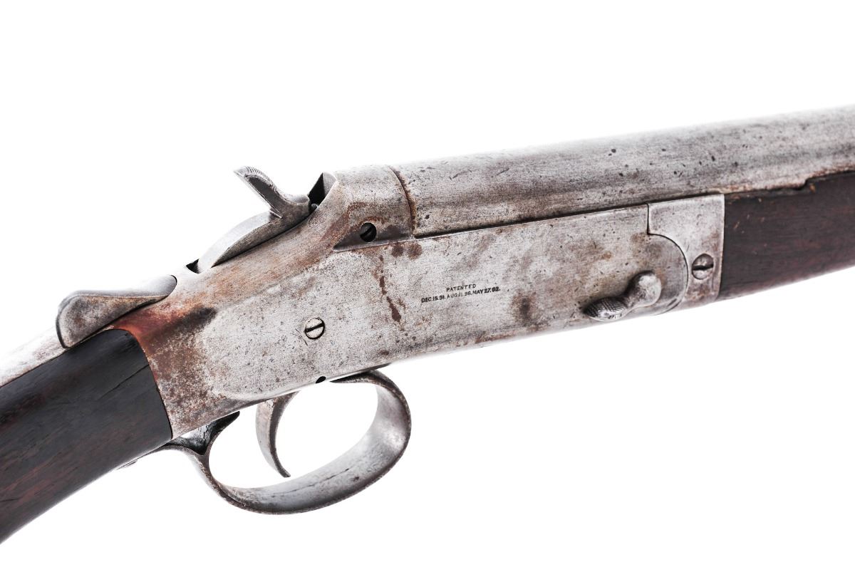 Mauregan Arms Break Action Single Shot Shotgun, #529, 16GA cal., 30'' barrel, white metal finish, two-piece smooth wooden stock, no sights. Condition is fair. No metal finish remains. Stock is dark with fire losses to the buttstock, many scratches and names scratched into the butt stock. Buttplate is cracked in half. Action is tight, bore is dark. Est.: $50-$100. (C&R)