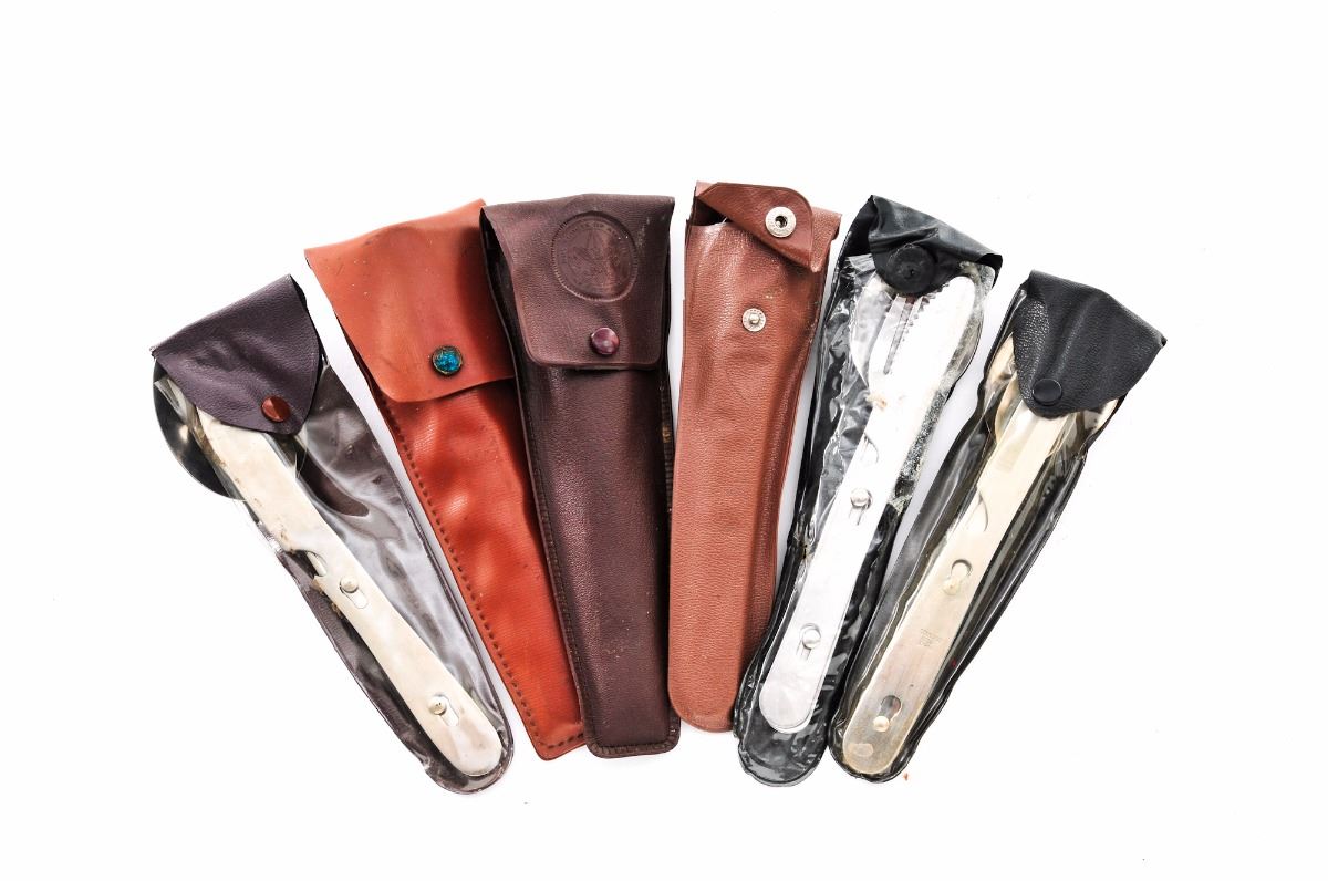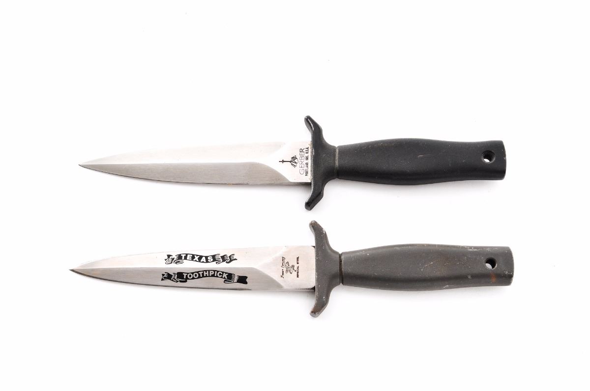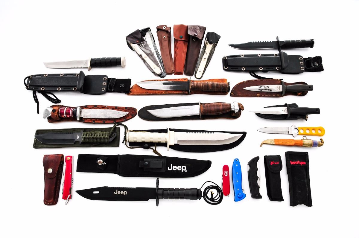 Lot of Misc. Edged Weapons: Sixteen (16) fixed blade and folding knives, including a Gerber boot knife with leather sheath; misc. Chinese made dive and survival knives; Kershaw Model 1060 folding knife; USMC fighting knife by Camillus, in brown leather sheath, missing keeper strap; six (6) sets of camping utensils, two marked ''Boy Scouts of America''; and four (4) misc. leather sheaths for fixed blade knives, one appears to be for a post-war MK II fighting knife. Conditions range from good to excellent, some are unused. Est.: $250-$350/lot.