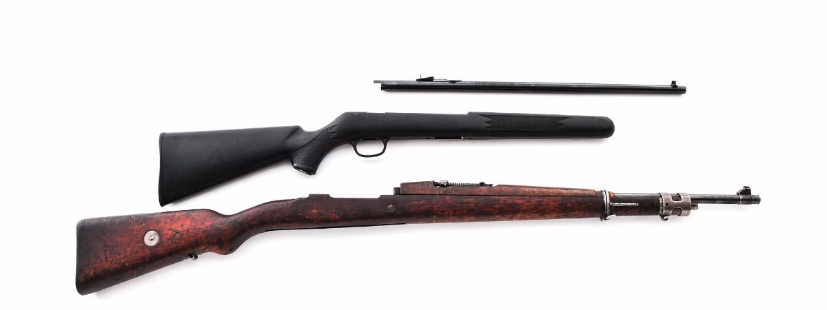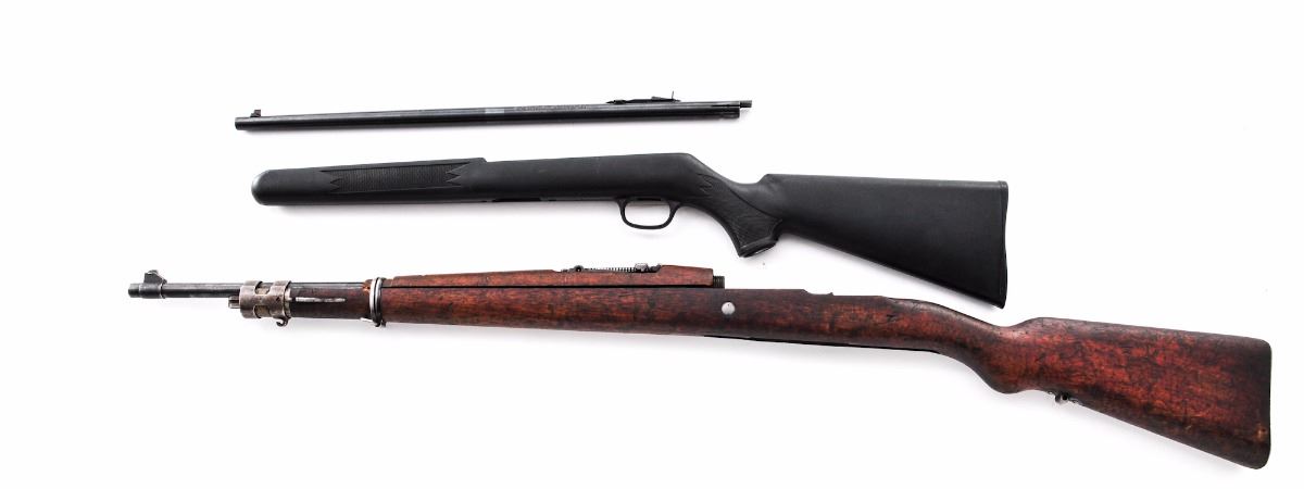 Lot of Two (2) Stocks and Barrels: (1) Mauser K-98: Stock is in good condition with oil staining and the usual bumps and bruises. Includes bayonet lug, upper barrel band, upper stock band, and barrel with bright bore and rear ladder sight. (2), Savage Model 64 composite stock and barrel with bright bore. Est.: $100- $200/lot.