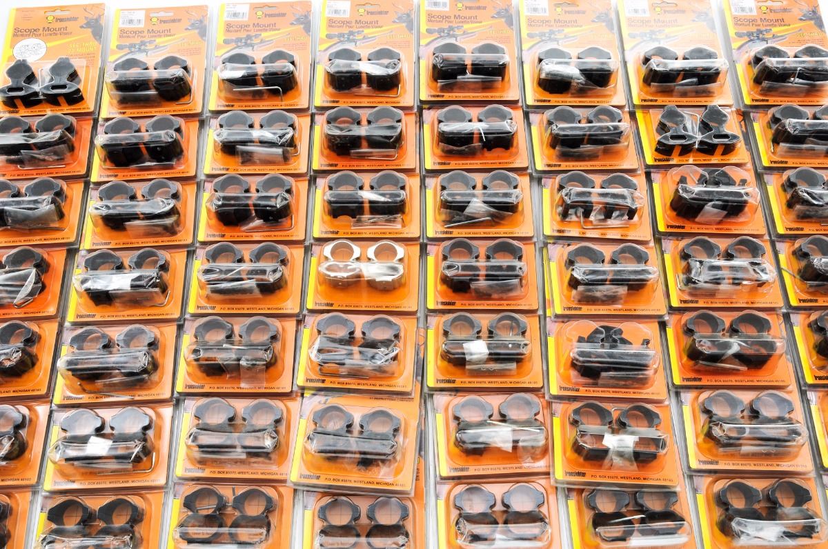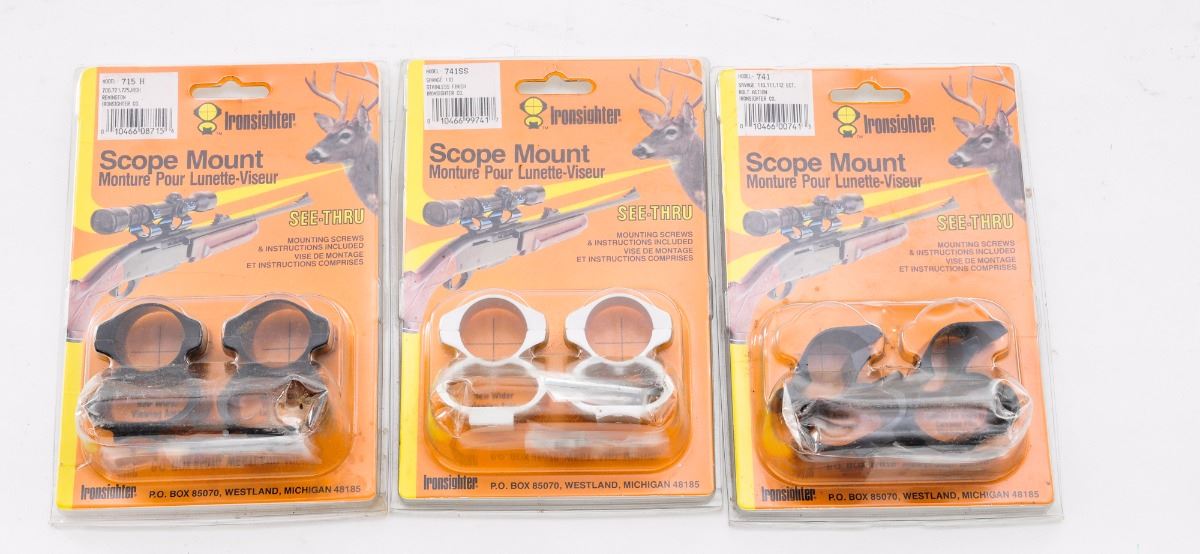 Lot of Approx. Fifty-Five (55) Sets of Scope Rings, by Ironsighter, for various firearms including Win. Model 94, Rem. Model 700, Savage 110, Browning A-Bolt, etc. All are new and in their original packaging; some packaging shows wear. Est.: $250-$400/lot.
