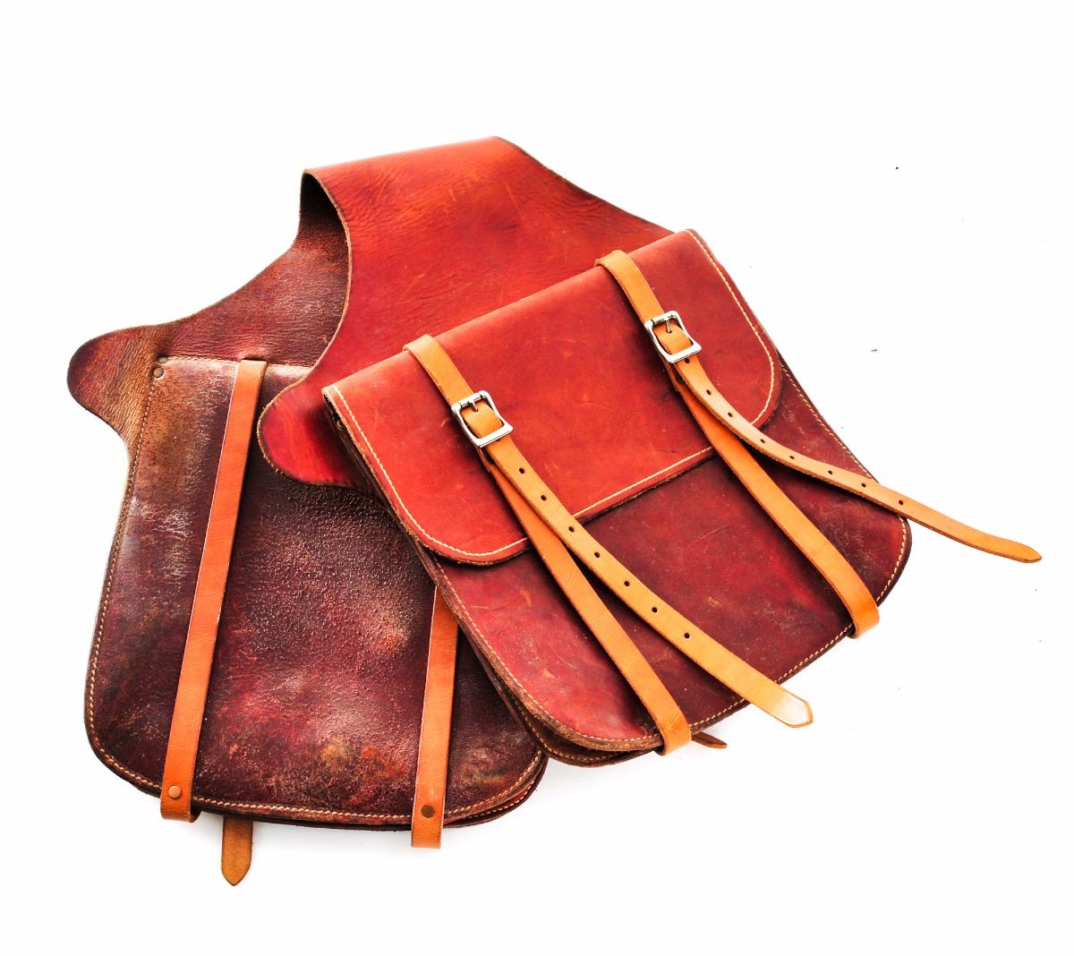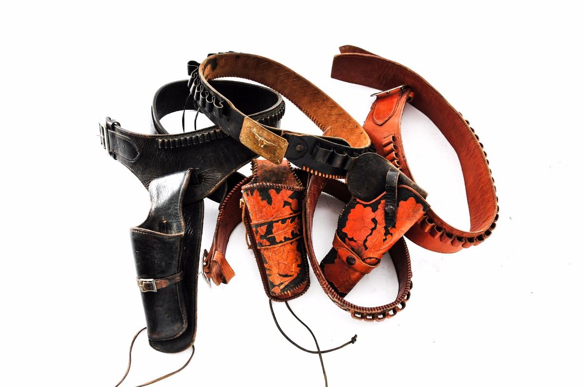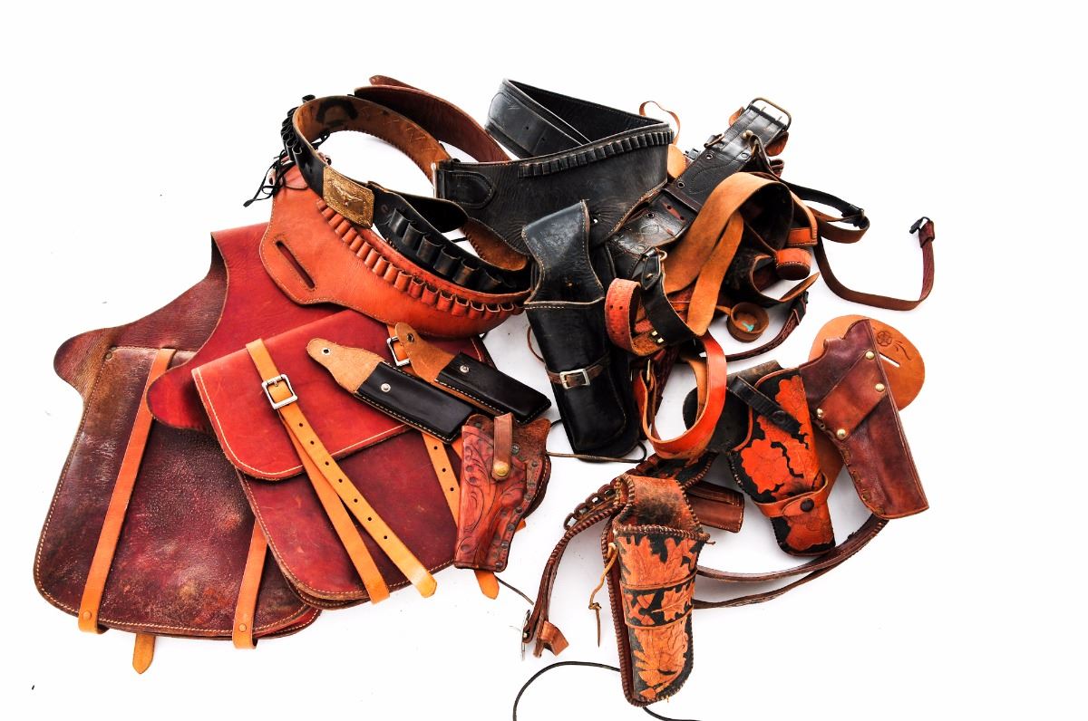 Lot of Approx. Twenty (20) Leather Items, including two holster rigs, one black leather and one brown/black leather with tooled design; set of leather saddlebags, unmarked; plus various holsters, belts, slings, scope covers, etc. Conditions range from fair to fine. Saddlebags with light mildew. Condition of many items would improve with a thorough cleaning. Est.: $150-$300/lot.