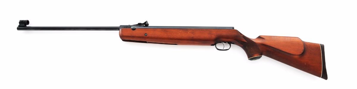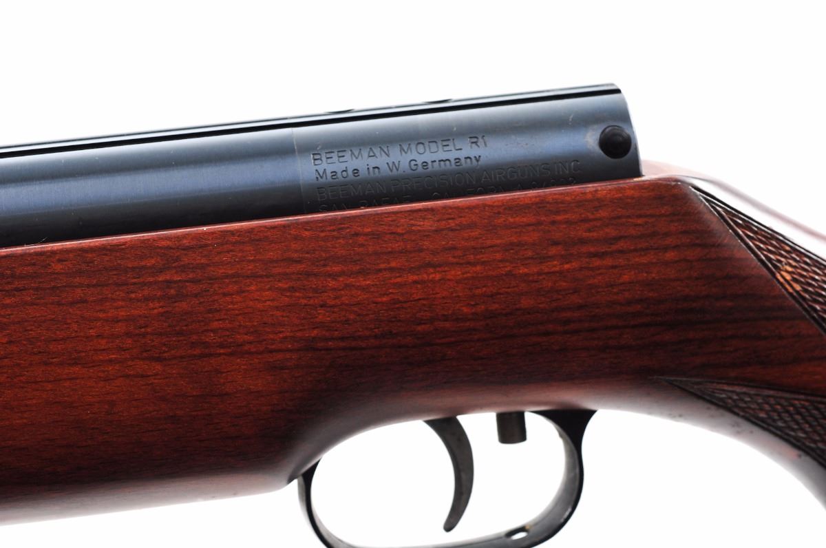 Beeman Model R1 Pellet Rifle, #912246, .177 cal., 19.75'' barrel, blue finish, checkered cheekpiece pistol-grip birch stock, with Beeman hard rubber butt pad; factory sights and adjustable trigger are included. Made in Germany. Condition is very good with most original blue remaining. Stock with mild scuffs from handling; checkers show staining and minor marks. Gun shows use but no abuse. Est.: $300-$500.