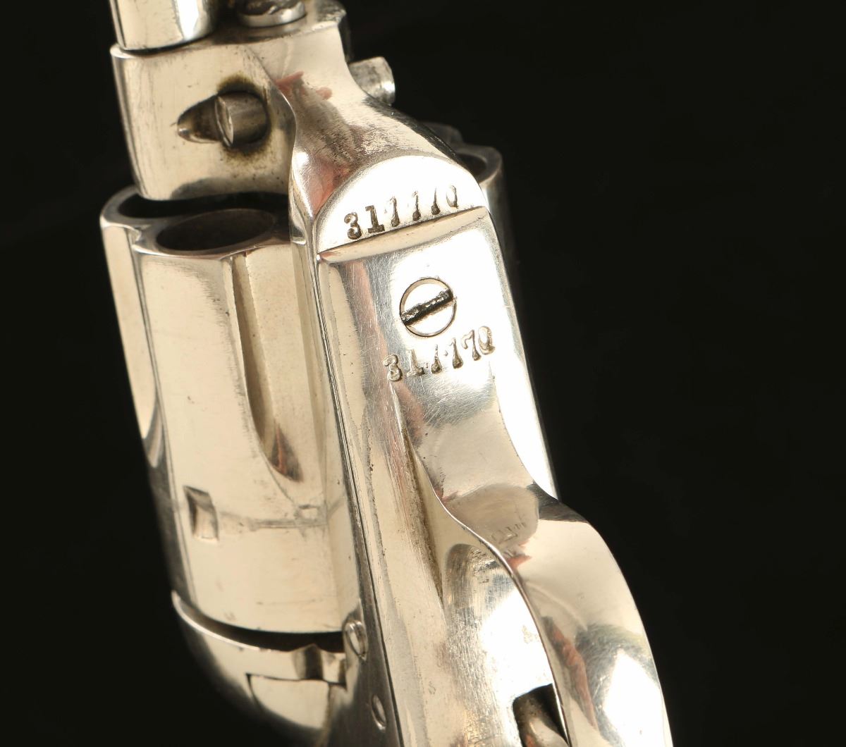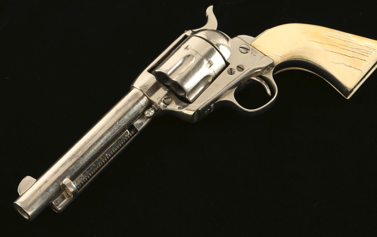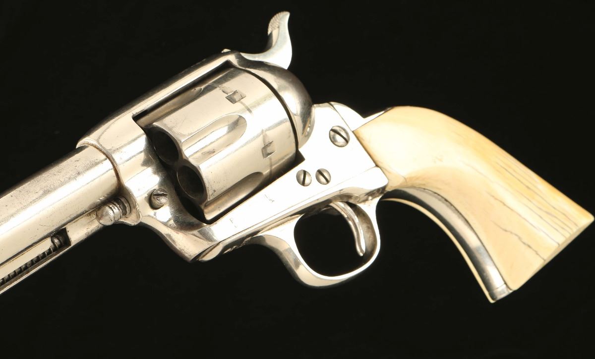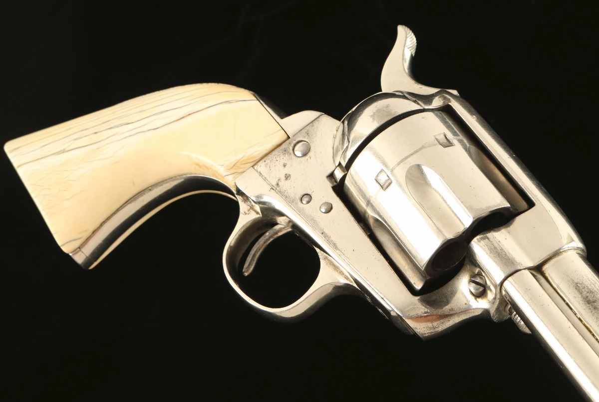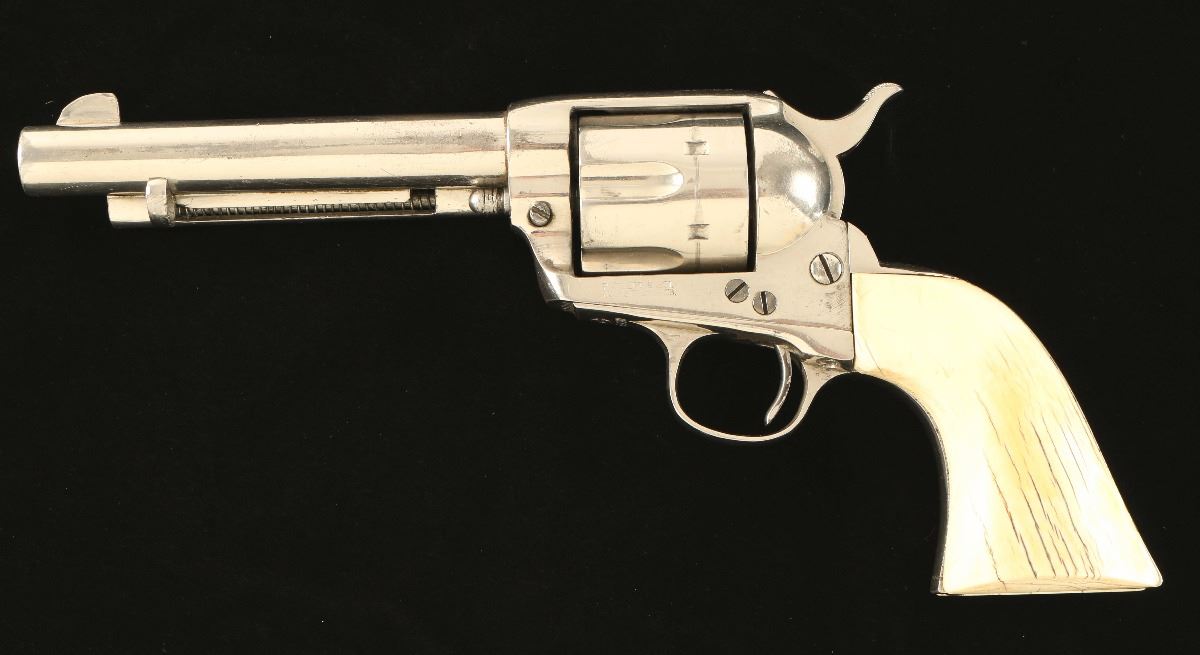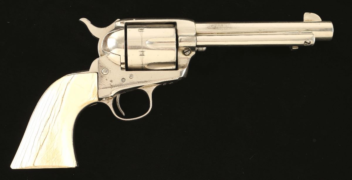 'First Generation' Refinished sing action revolver chambered in .45 Colt, circa 1911. Features a nickel plated refinish, 5 1/2" barrel with one line address, blade front sight, 'v' notched rear sight, fluted six shot cylinder, ejector rod, two line patent markings, checkered hammer spur, and one piece smooth ivory grips. Matching numbers on frame, trigger guard and backstrap. Revolver retains approximately 80% of it's nickel refinish showing a loss on the recoil shield and other small losses. The revolver also bares a heavy drag ling and handling wear. Action is smooth, markings are faint, and grips are very good with cracks but no observed losses.
