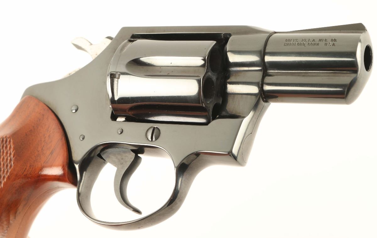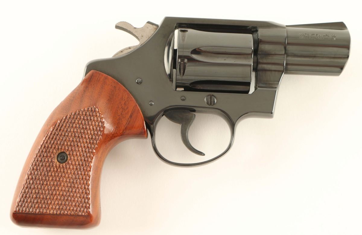 '3rd Issue' Snub nosed double action revolver chambered in .38 Special, circa 1977. Features a blued finish, 2" barrel, fixed sights, shrouded ejector rod, long fluted six-shot cylinder, smooth trigger, serrated hammer spur and two piece checkered walnut grips. Revolver shows a few small losses and light scattered surface rust on the hammer & cylinder flutes with approximately 95% finish intact overall. Action is smooth, bore is pristine, and grips are fine.