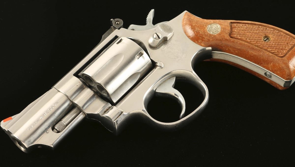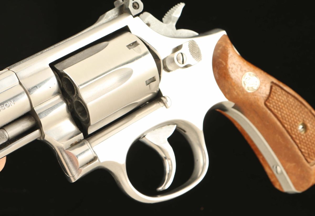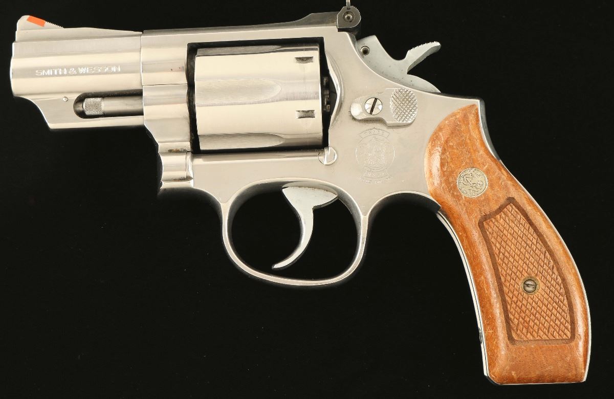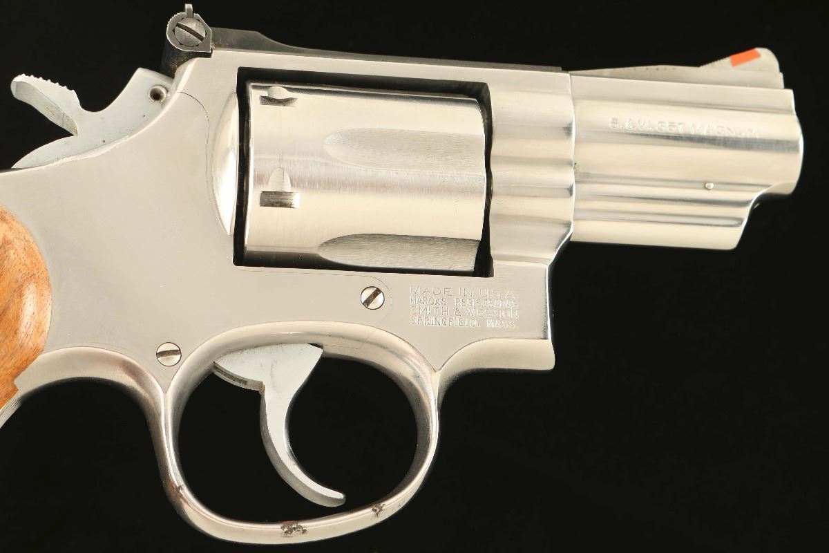 Stainless steel double action revolver chambered in .357 Magnum. Features a brushed finish, 2.5" barrel with solid top rib, shrouded ejector rod, ramped blade front sight with red insert, micrometer click rear sight, fluted six shot cylinder, .312" smooth combat trigger, .375" semi target hammer, and two piece Smith & Wesson medallion Magna grips. Revolver shows handing wear including light scuffs & scratches and also bares a couple small spots of surface rust on the trigger guard. Action is solid, bore is excellent, chambers are dirty and grips are good showing wear & small scratches.