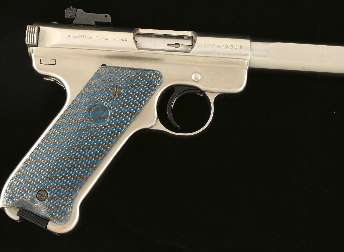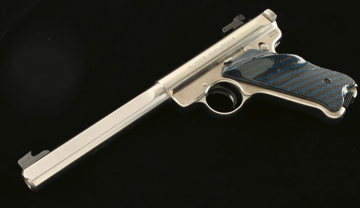 'Competition Target Model' Stainless steel blowback-operated semi-automatic target pistol chambered in .22 Long Rifle. Features a brushed finish, 6.88" flat sided heavy barrel, patridge front sights, adjustable rear window sight, drilled & tapped frame, serrated target trigger, hold open lever, thumb safety, factory 10 round magazine with silver eagle & red background and two piece blue carbon fiber target grips with Ruger logo in the right panel. Pistol exhibits some fine scratches with no major wear. Action is smooth, bore is excellent and grips are fine.