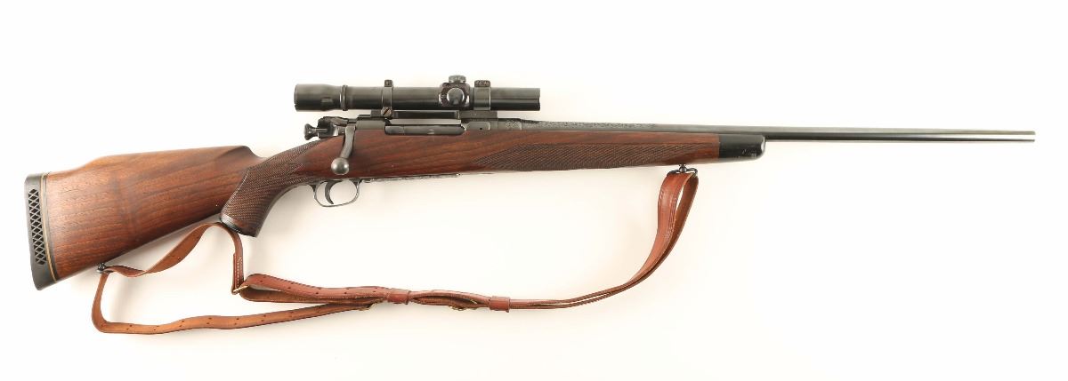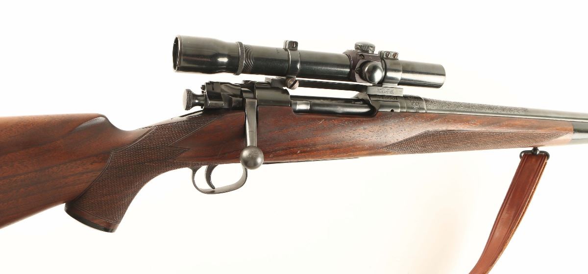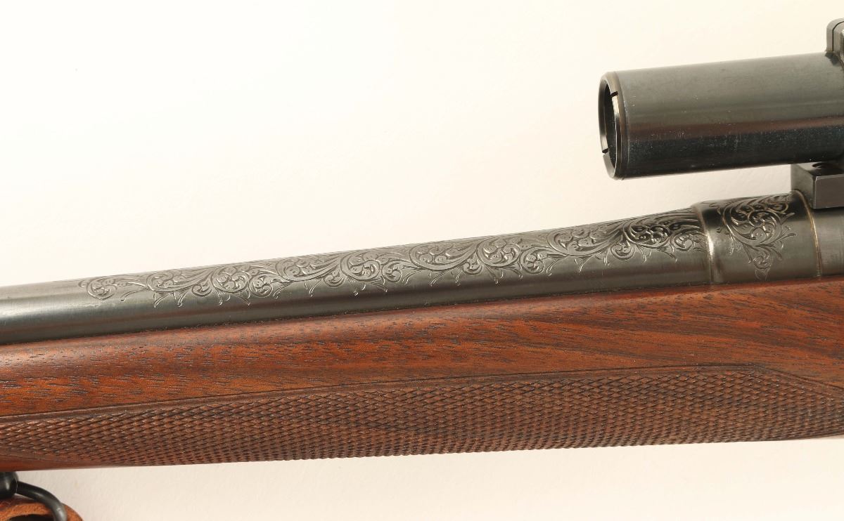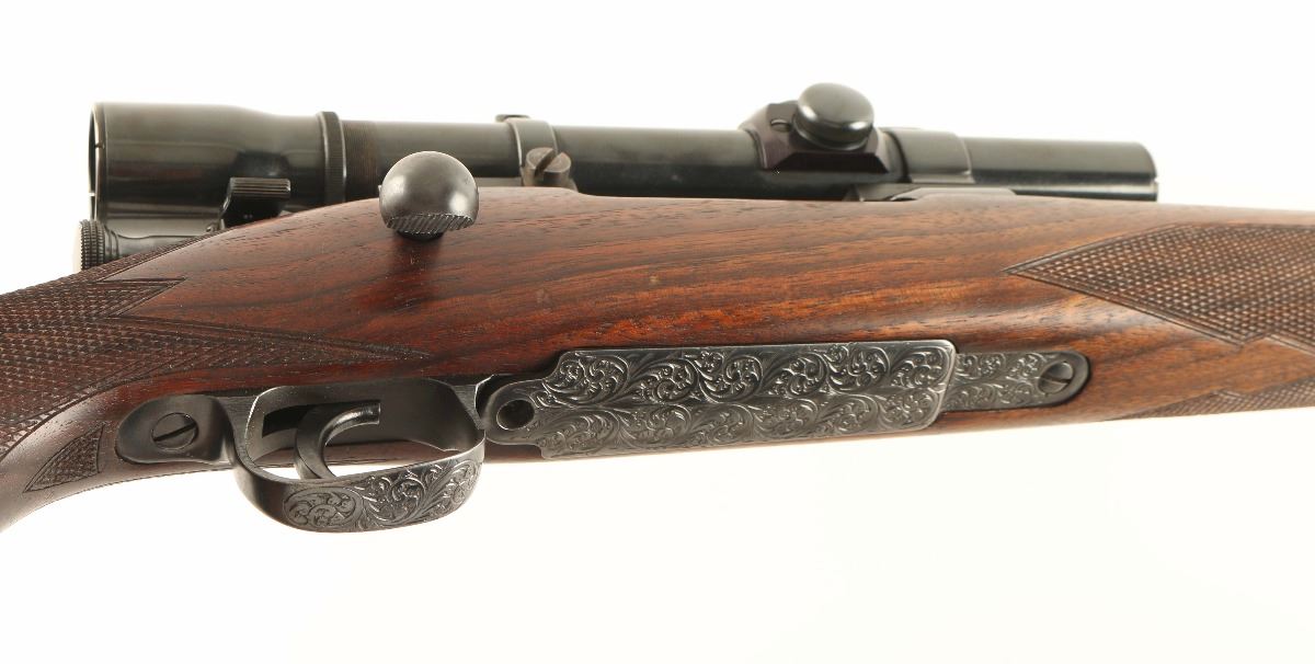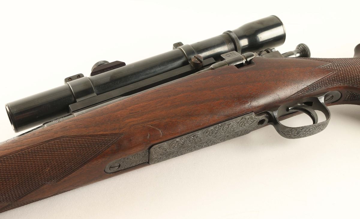 Finely sporterized U.S. military bolt action service rifle chambered in .30-06 Springfield. Features a blued finish, scroll engraving, no provisions for sights, Weaver K25 fixed power scope, internal box magazine with cut-off switch, manual safety, leather sling and nicely checkered Monte Carlo style walnut stock. Rifle shows light muzzle wear and some finish loss around the magazine cut off with approximately 93% finish intact overall. Action is smooth, bore is very good and wood stock is near fine with few small blemished.