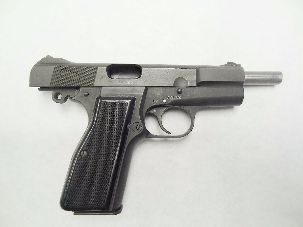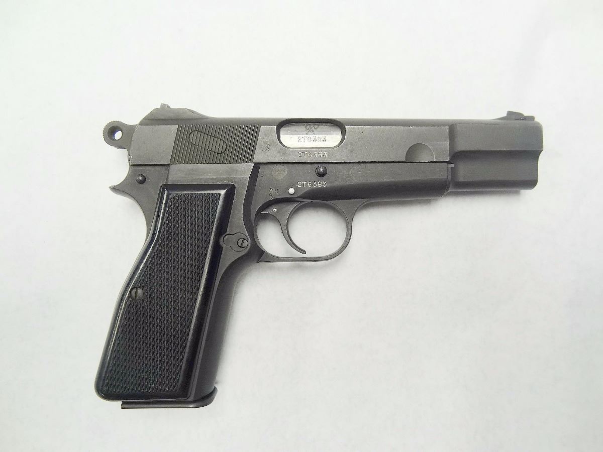 STOCK D-8, BROWNING (INGLIS) MKI* 9MM, 4.5” BARREL. CANADIAN MADE.MINOR SCRATCHES & WEAR, BLACK FINISH, PISTOL IN VERY GOOD CONDITION 7.5/10. S/N:2T6XXX