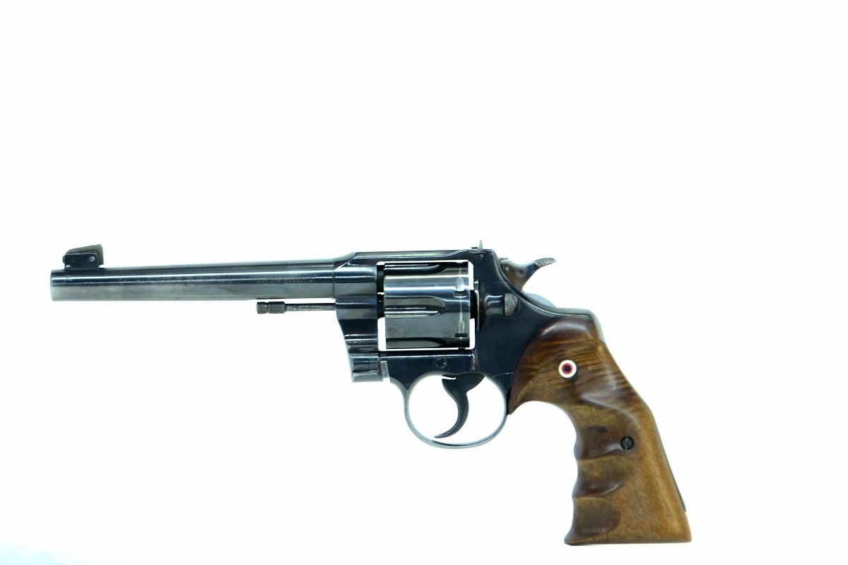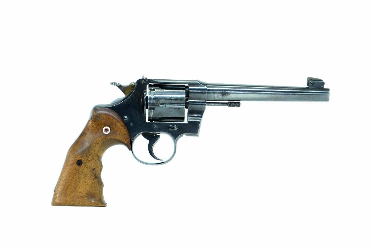 STOCK 2291HR-0053 - G1 COLT OFFICERS MODEL 38, HEAVY BARREL, 6” BARREL, CUSTOM GRIPS, ADJUSTABLE SIGHTS, CONDITION 7.5/10, SN. 61XXX
