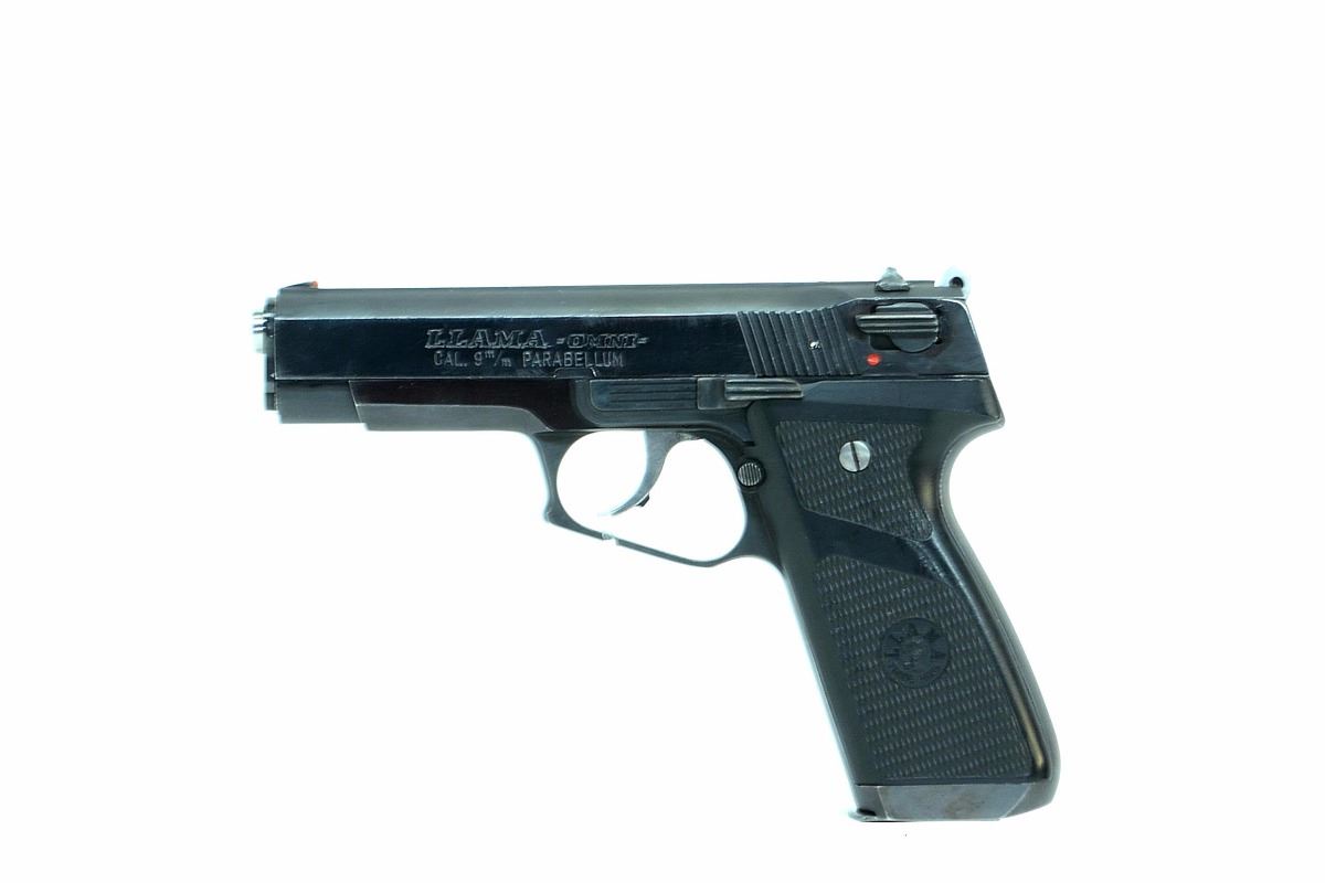 STOCK 2312HR-0063-G1, LLAMA, MODEL OMNI, CAL 9MM, SEMI-AUTOMATIC, COMES WITH TWO MAGS, PLASTIC CASE,CHECKERED PLASTIC GRIPS, FINISHED SIGHTS, DOUBLE ACTION, BARREL 110MM / 4.3”, MADE IN SPAIN, CONDITION 8/10, SN. PA4XXX