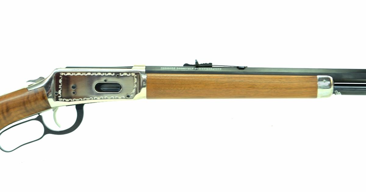 STOCK 284R-0508-G1, WINCHESTER MODEL 94 THEODORE ROOSEVELT COMMEMORATIVE CAL 30-30. LEVER ACTION, BARREL LENGTH: 26". OCTAGONAL BARREL, NICKEL PLATED RECEIVER, SADDLE RING. CONDITION: 9/10. SN: TR50XXX