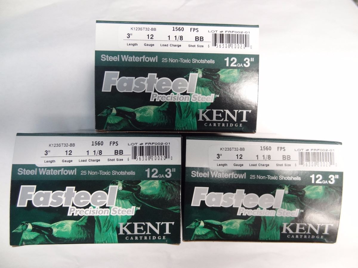 Lot 553 3 BOXES KENT FASTEEL 12GA 3" 1 1/8 LOAD, BB SHOT