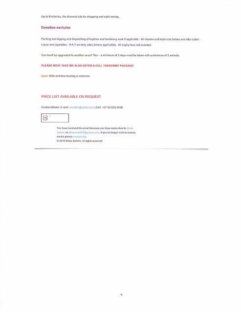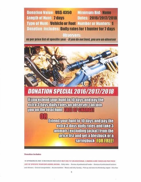 7 day African hunt for 1 hunter in South Africa with Wiets Safaris. The donation includes daily rates, service of professional hunter, service of professional trackers and skinners, ground transportation, accommodations, meals and laundry, pick up and return to Kimberley airport, one free trip to Kimberley (the diamond city for shopping and sight seeing). 1 x springbuck and 1 x blesbuck included IF additional 3 animals are taken as per price list of specific year excluding jackal. If you extended the hunt to 10 days at regular daily rates an observer can join you on the total hunt free of charge!. Click on image for additional information.