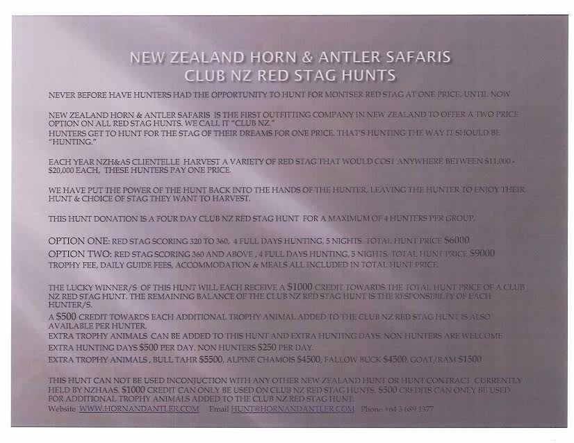 Lot 6 $1,000 credit toward Club NZ Red Stag Hunt with New Zealand Horn & Antler Safaris