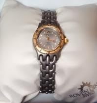 Ladies Titanium Roven Dino watch with Swiss quartz movement, sapphire crystal, and 14 kt gold plating bezel. Water resistant to 200 meters