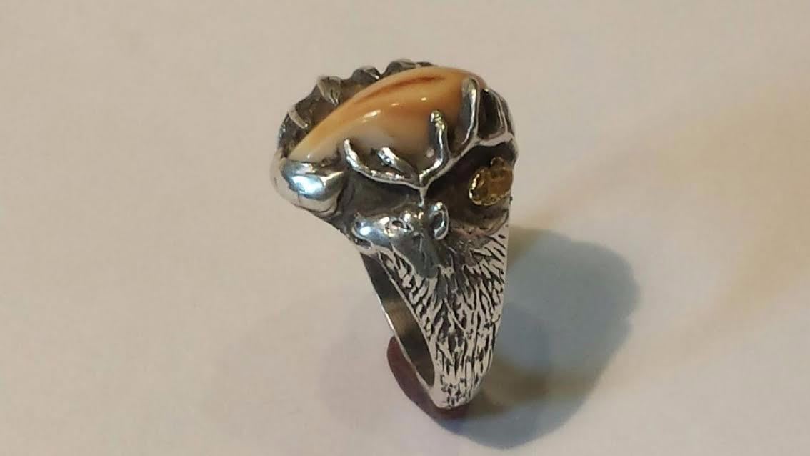 Men’s elk ivory ring. Each item made at Jewel Crafters in Yakima, WA is unique and custom made. The actual ring sold at the auction may look a little different from the picture, depending on the specific elk ivory it is created from. The design is the same.