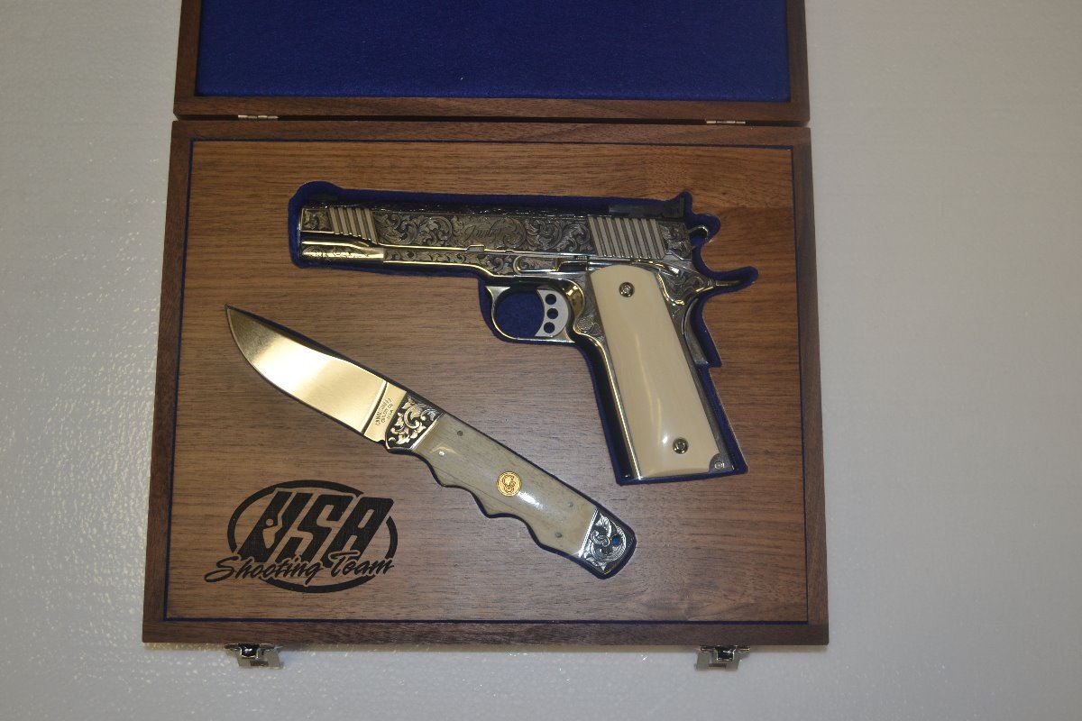 Custom Kimber .45 caliber STS Target II featuring highly polished stainless steel and full engraved by Rob Bunting of the Baron Technology Custom Shop. The grips are antique ivory bone made and fitted by Nutmeg Sports LLC.The firearm is accompanied by an antique ivory bone Catskill Hunter knife made by Canal Street Cutlery. The bolsters on the Canal Street knife are polished and hand cut to match the engraving on the firearm. Both the Kimber and the knife are presented in a hand made French fit American walnut case made by Hampels Woodland Products. Donated to MDF by USA Shooting Team.