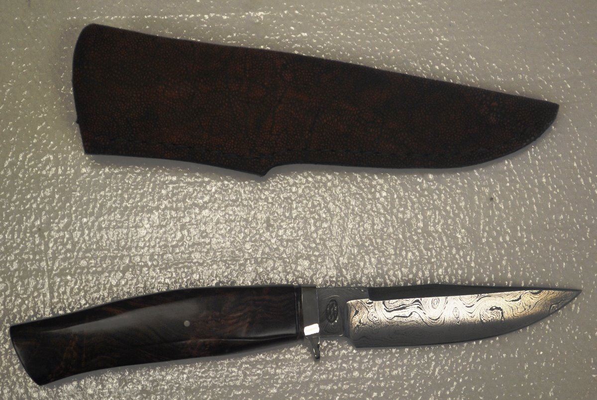 WM Knives Custom 4 5/8" Damascus hunter w/ burl wood handle and w/ Elephant hide sheath.
