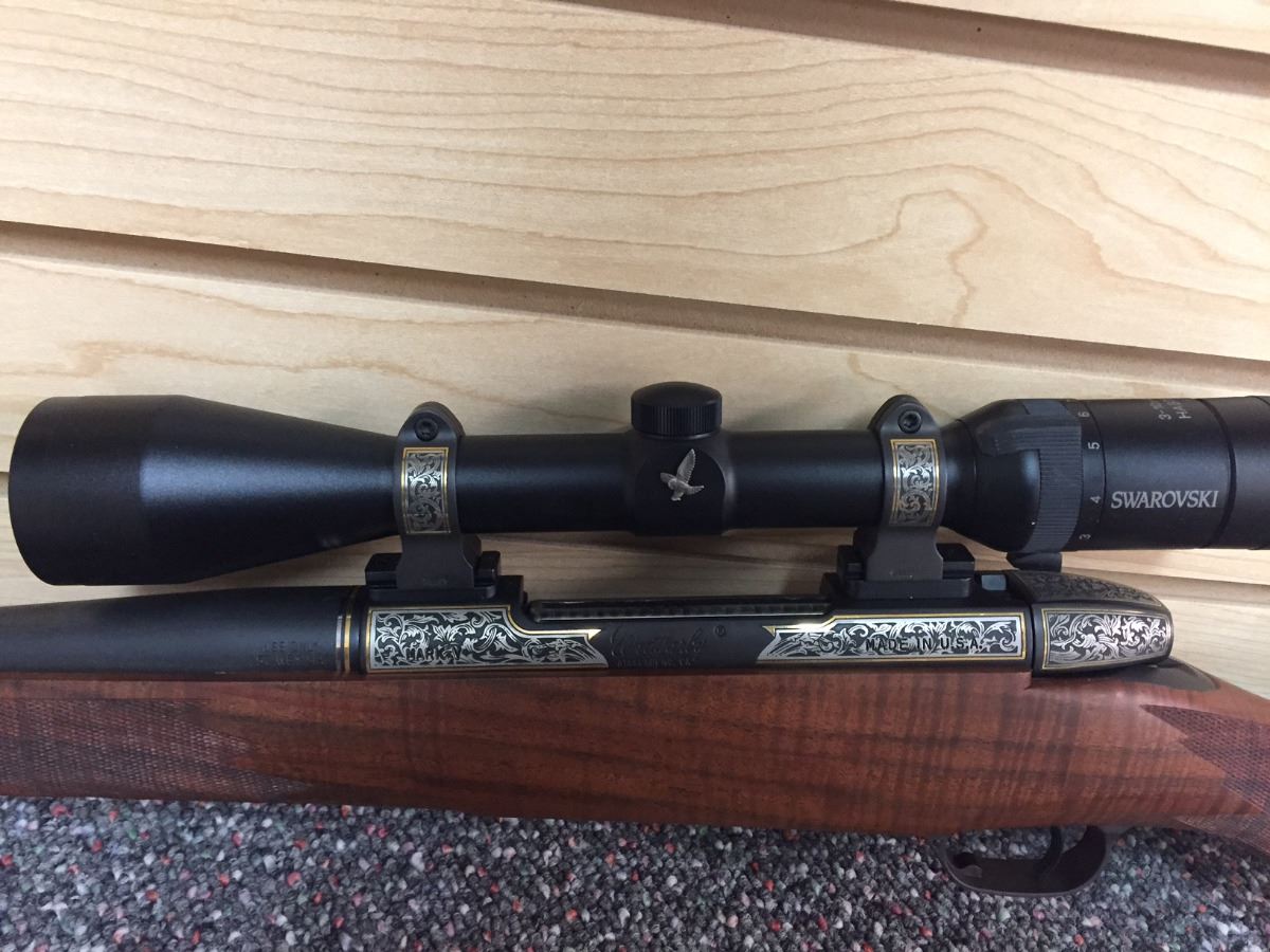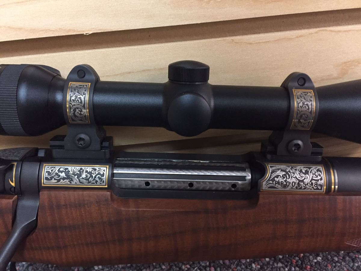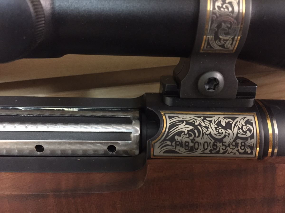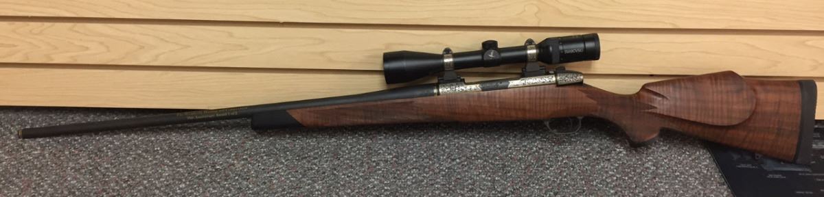 Rosenbruch Wildlife Museum has donated this elegant 300 Weatherby Mag Gloss B/A 26”. Created by Weatherby Inc. for the 50th anniversary of Weatherby Foundation International, this unique piece comes with a custom lock, a trial target, and a custom rifle case. Engraved on the barrel is “The Weatherby Hunting and Conservation 50th Anniversary Award 1 of 2.” Also included with this donation is the original paperwork from Weatherby Inc. (an owner’s manual and a 2-page rifle specs document).