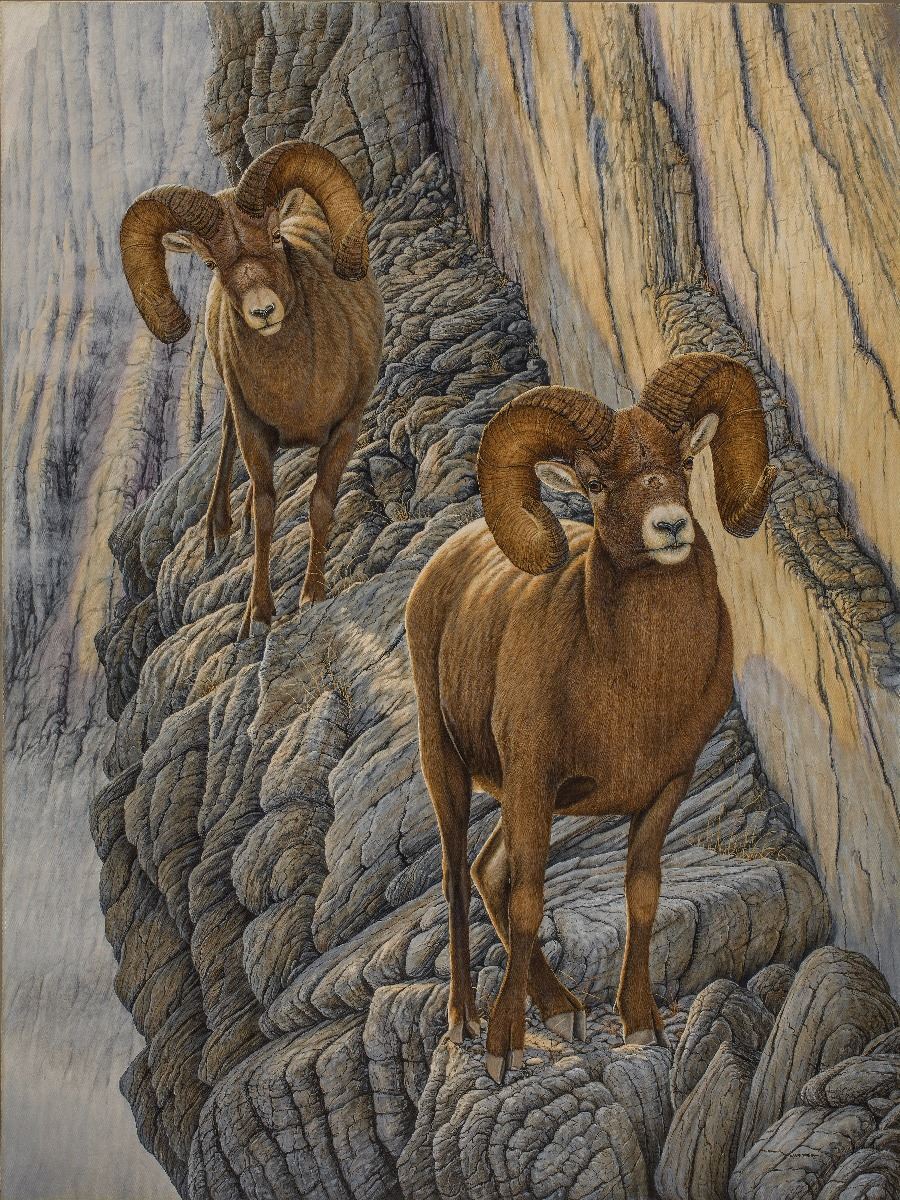 Donation: “On the Edge” Montana bighorn sheep painting by Craig Phillips this piece is 36x48. Craig graduated with a bachelor of art degree from Chico state university in 1977, and within 5 years he found himself pursuing his career in the beautiful state of Montana. With an abundance of wildlife outside his backdoor he is able to observe sketch and photograph his subjects. This easy access to wildlife helps him capture extreme detail for which he is so well known. Over the years he has supported many wildlife and non-profit organizations including (Wild Sheep Foundation -28 years, donating art to raise funds to support sheep, elk, mule deer, ducks, turkeys and even trout.) He currently resides in Thompson Falls, Montana.