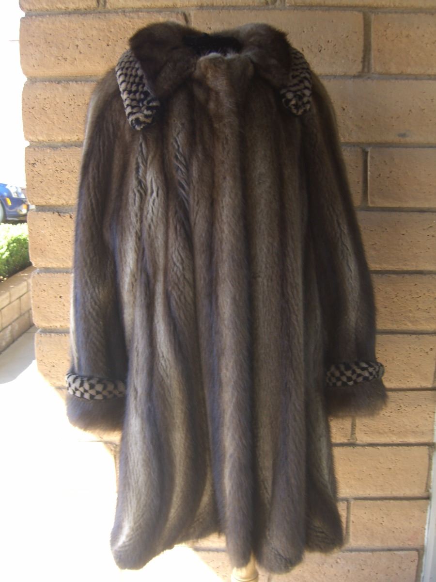 Donation: This is a beautiful natural beaver jacket with sheared beaver trim on the collar and cuffs. This is a 3/4 stroller in size large and is not exchangeable.