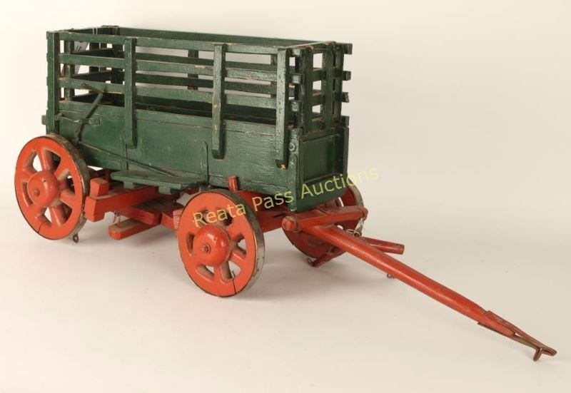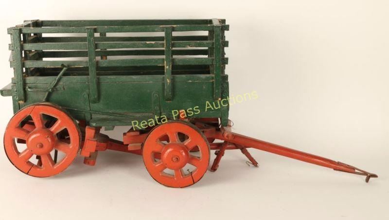 True to scale mini wagon, wood construction, painted green and red, measures 21X13.
