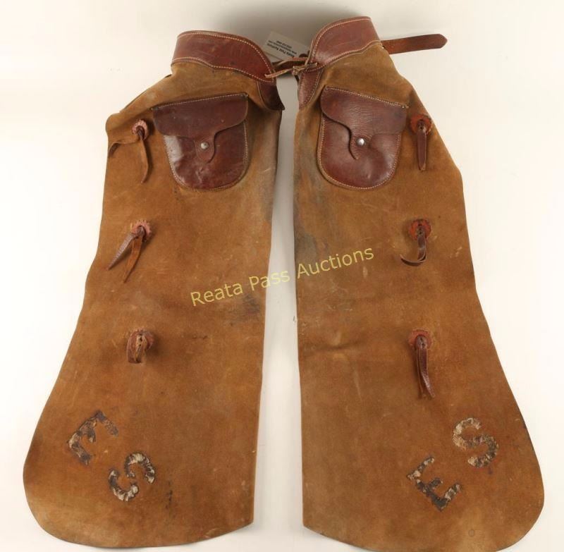 "H H Heisler Denver Colo', butterscotch suede with smooth brown leather belt, conchos, and pockets. "E S' on both bottom outside corners of chaps.