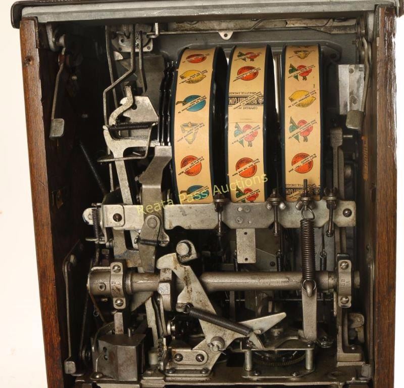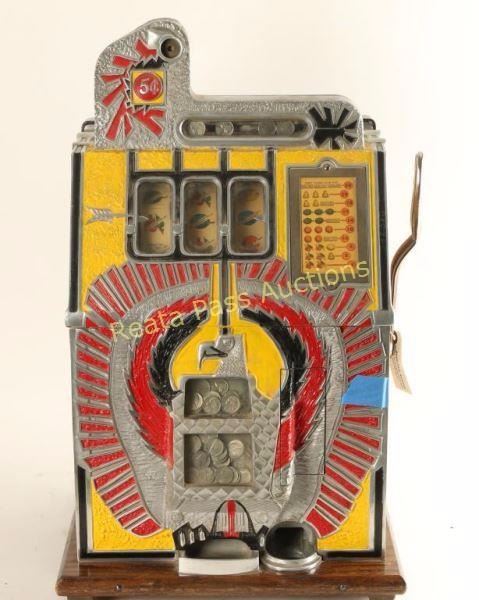 Metal and wood construction. Silver front has eagle motif with bright yellow, red and black paint. Talons of eagle clutch change bowl. Pull arm to operation. Measures approx. 28"x16"x15". Back opens with key.