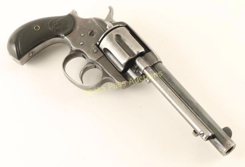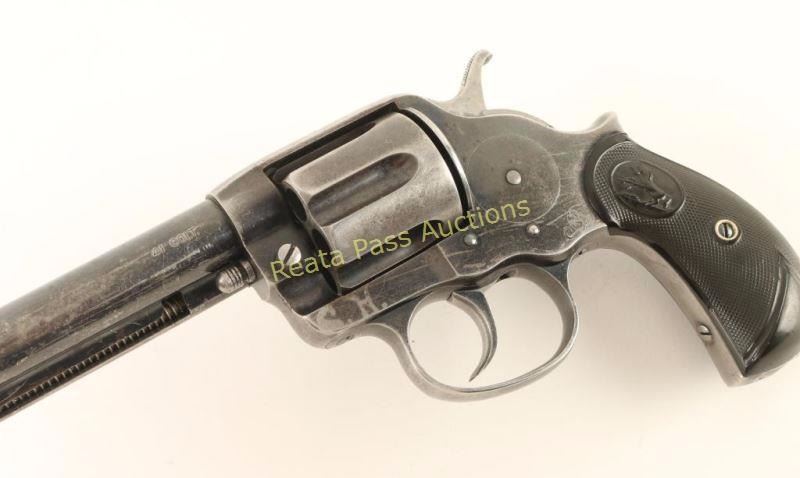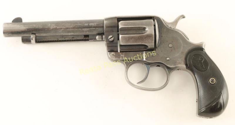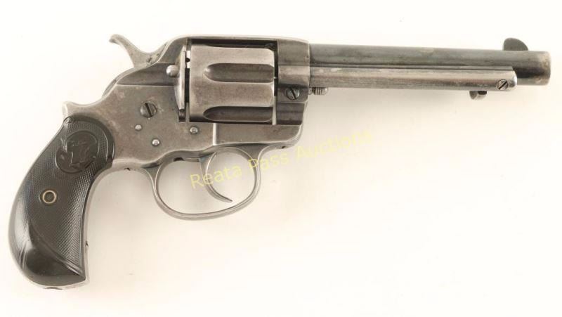 'Frontier' Double action six-shot revolver chambered in 41 Colt, circa 1894. Features a blued finish, 5 1/2" barrel with single line address, ejector rod, blade front sight, v-notch rear sight, smooth trigger, checkered hammer spur, fluted cylinder, swing-out loading gate, no lanyard loop and checkered two-piece Colt hard rubber bird's head grips. Includes a Colt factory letter confirming it's configuration and stating it was shipped to Montgomery Ward & Co. of Chicago, Illinois on March 6, 1986 in a two gun shipment. Revolver exhibits approximately 65% of it's original blued finish showing honest wear and a light amount of scattered pin prick pitting. The marking are mostly sharp with the serial number slightly less clear. Two addition marking have been made on the left side of the frame, a "C.H." in the finish and "CH" stamped in the metal. Action works well, bore is excellent and grips are near fine. Condition is fine. ***Antique Firearm***