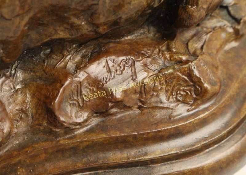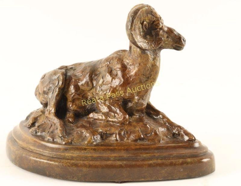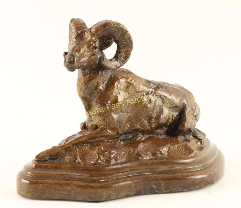 Depicting Ram lying down, limited edition 114/150. Artist Shinabarger, signed on base. Measures 7"x4 1/2". Tim Shinabarger is an award-winning American sculptor and painter internationally known for his portrayals of wildlife. Today, his works in bronze can be found in major museums and private collections, including the Autry National Center’s Museum of the American West in Los Angeles and the National Museum of Wildlife Art in Jackson Wyoming. A native of Montana, Shinabarger spent his youth and early adulthood never far away from his beloved wilderness areas in the northern Rocky Mountains. The past few decades have seen Shinabarger going further afield, exploring some of the most remote corners of the continent to gather reference material for new pieces. “Nature is the source of my inspiration,” he says. “There is no replacement for total immersion if what you’re seeking is the truth.” Critics hail Shinabarger’s work both for its mature, sophisticated approach to composition and for the artist’s ability to communicate the very spirit of his subjects. Expanding his corpus, Shinabarger has also won acclaim for his depictions of African and Alaskan mega fauna. He is, without question one of the finest wildlife sculptors of his generation. From the Bill A. Gary Estate Prescott, AZ.