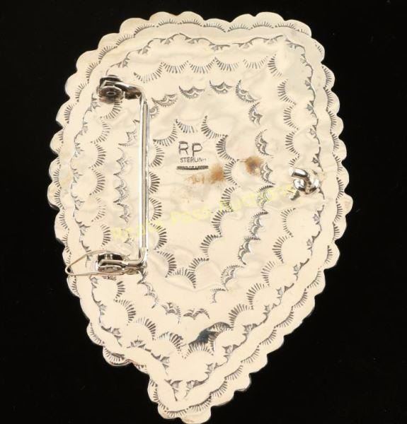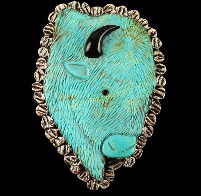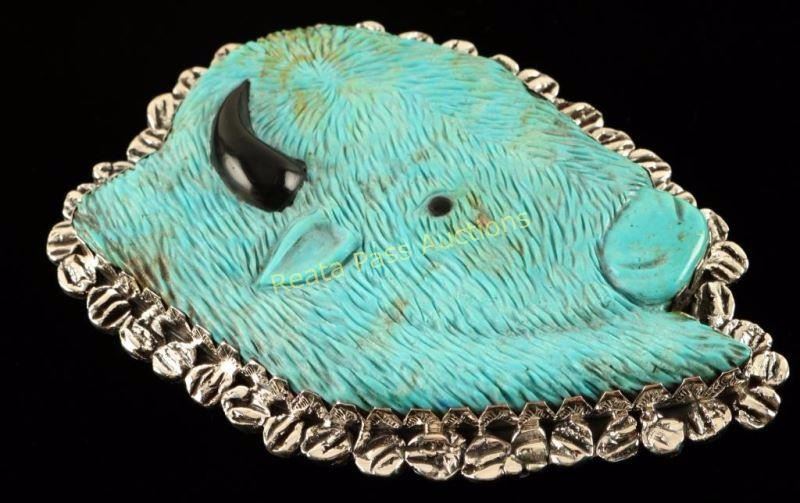 Large buffalo head with inlaid horn and eyes. Marked 'R.P. and Sterling', exhibition quality, rare in this size. Measures 4"x2 3/4".