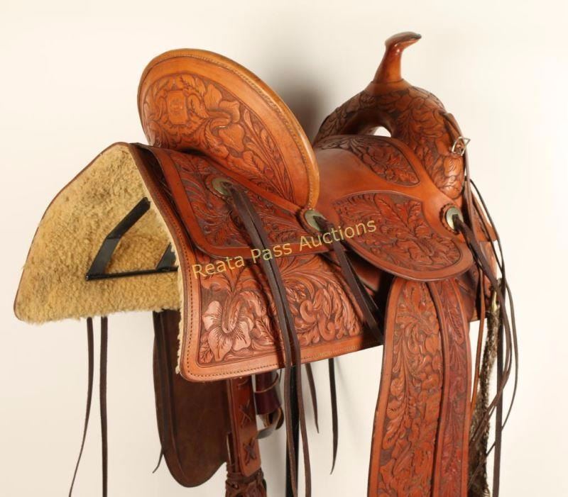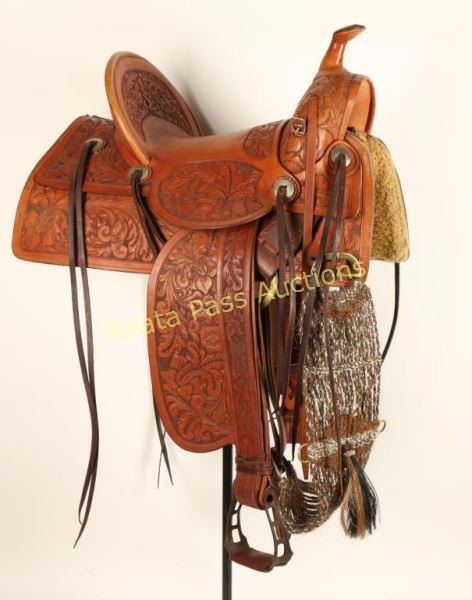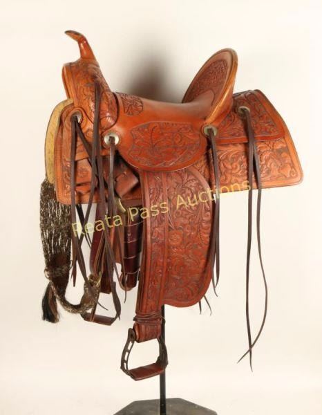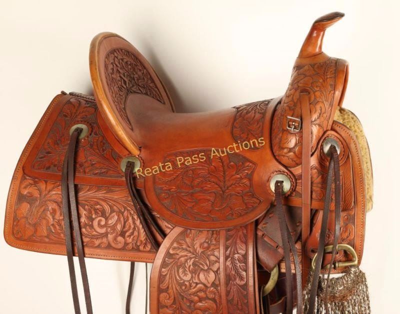 Beautiful western floral tooled saddle that originally was made by Porter than reconditioned by Dick Levett from the Tooling Bench of Bakersfield California. Overall very good condition, maker marked by the tooling bench twice.