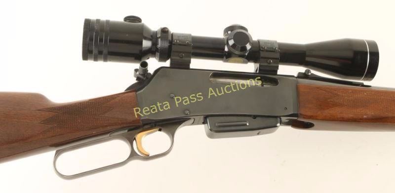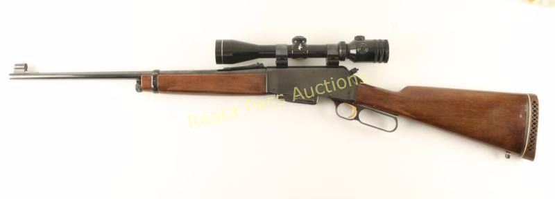 Japanese made magazine-fed lever action sporting rifle chambered in .308 Winchester, produced by Miroku in 1979. Features a blued finish, 20" tapered barrel, ramped & hooded blade front sight, adjustable rear sporting sight, Tasco 3-9x 40mm scope with swing-out rings/bases, detachable 4 round magazine, serrated gold trigger, checkered hammer spur extension, swivel studs, checkered walnut forend and straight grip shoulder stock with factory recoil pad. Rifle exhibits approximately 94% of it's original finish showing handling marks, scratches and a small amount of surface rust on the front sight. Action is very smooth, bore is pristine, optics are clear and wood stocks are very good with a couple small nicks & some minor blemishes. Condition is very good++. ***Modern Firearm***