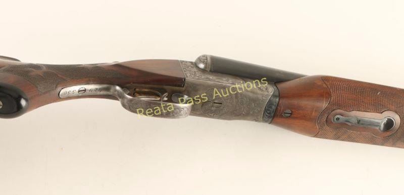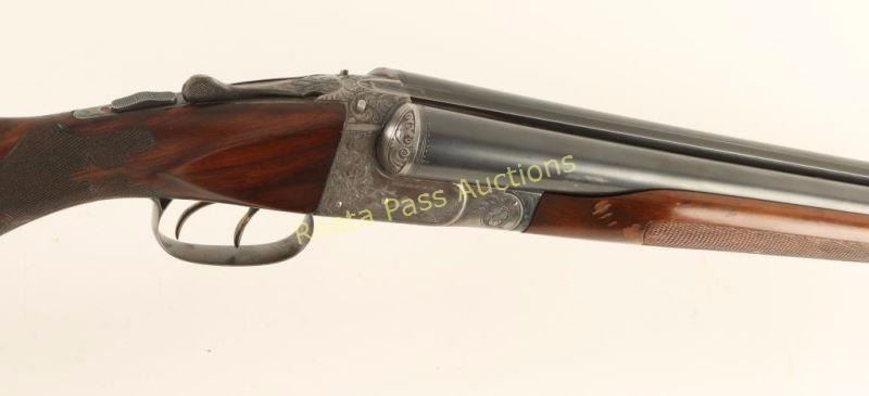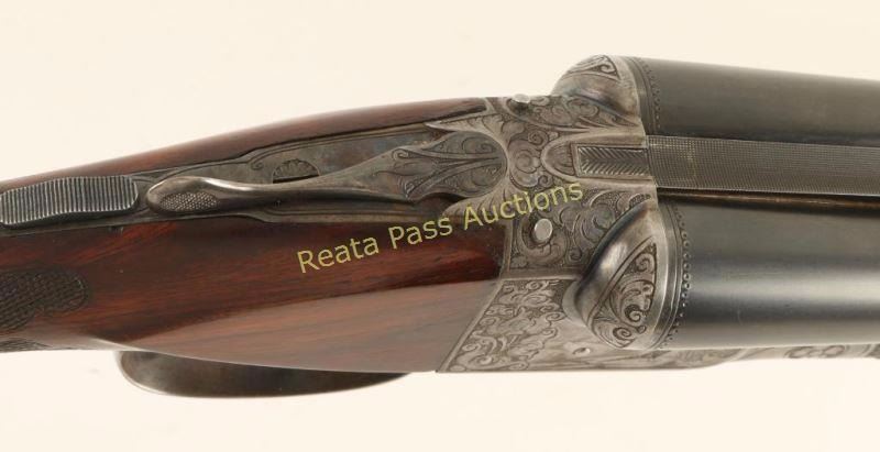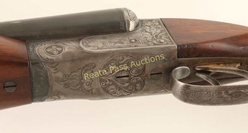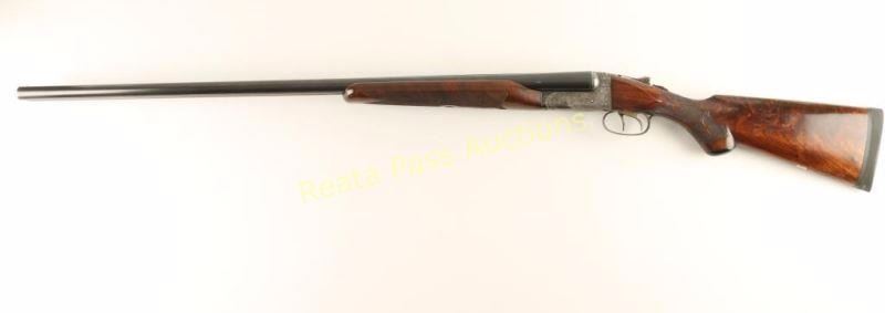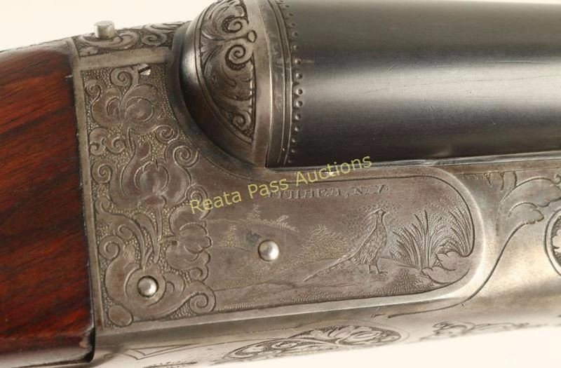'Grade 4 New Ithaca Double' Side-by-side double barrel boxlock shotgun chambered for 2 3/4" 12 gauge shells, circa 1926-1934. Features 32" blued barrels with a raised matte concave rib, extractors, bead sights, case hardened receiver with scroll engraving & bird game scenes, cocked indicators, checkered top lever, sliding tang safety, double gold wash triggers, fancy checkered select walnut beavertail forend with ebony inlay and pistol grip shoulder stock with black grip cap, blank shield escutcheon & Decelerator recoil pad. Barrels retain retain approximately 96% of their blued finish showing light carry wear and few handling marks/scratches. Receiver shows some case colors in protected areas with the the balance turned to a nice even aged grey patina. Bores are excellent, action is sound, markings are sharp and wood stocks are good+ with some small scattered losses. Condition is very good. ***C&R Firearm*** ***Modern Firearm1***