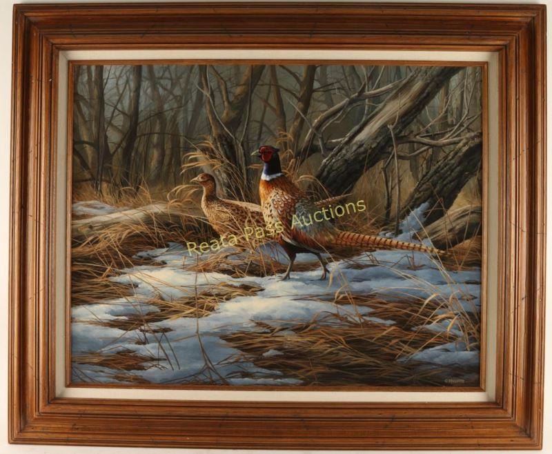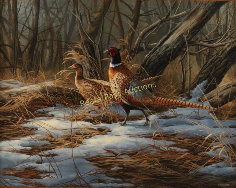 Depicting ringneck pheasants in a winter forest, signed lower right. Image measures 22"x28" in wood frame with linen inset. Celebrated wildlife artist, Rosemary Millette, is recognized for her unique ability to realistically portray her subjects while expressing their spirit throughout her paintings. This South Dakota artist has been developing her natural talents and sharpening her skills since she was a young girl. Through her formal education and work as a commercial artist, Millette has learned to approach her work with vivacity and employ rigorous self-discipline. Whether painting elk, pheasants or chickadees, her mastery of skills is apparent. By carefully studying her subject matter, Millette realistically portrays each animal's physical structure and tone. The use of light and color, the composition, and the perspective of each complementing background reveal and reinforce the quintessential qualities of the animal. Rosemary Millette is especially proud of her association with groups striving to preserve and protect wildlife and the natural environment. Her work has been selected for over a dozen state conservation stamps and she works closely with Pheasants Forever, the Rocky Mountain Elk Foundation and the Minnesota Deer Hunter's Association.