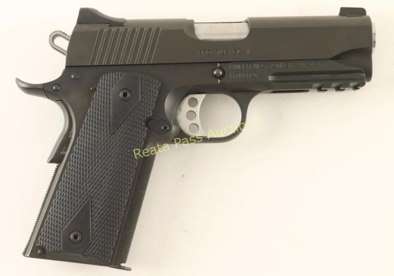 'Tactical Law Enforcement/Rail' High quality 1911-style semi automatic pistol chambered in .45 automatic. Features a matte black finish, 4" stainless steel barrel, Meprolight Tritium 3-dot night sights, serrated trigger, skeletonized hammer, beavertail grip safety, manual safety, checkered front strap & main spring housing, push button magazine release, 7 round factory magazine, steel receiver with integral accessory rail and two-piece diamond checkered black rubber grips. Pistol exhibits only a few light handling marks and some slide wear on the barrel. Action is smooth, bore is pristine and grips are fine. Condition is excellent. ***Modern Firearm***
