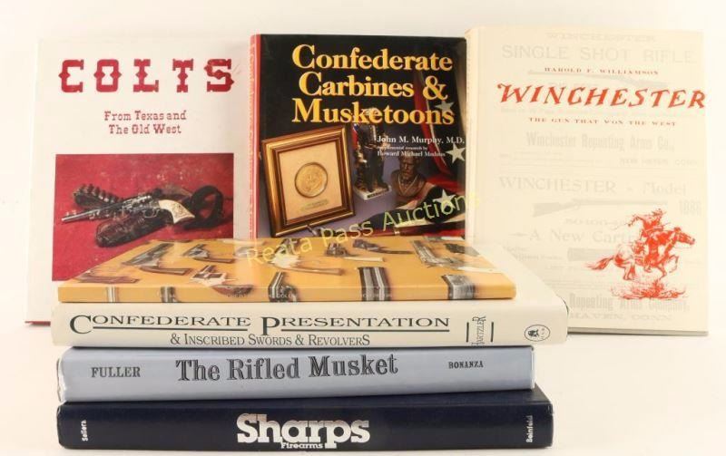 Including; "The Rifled Musket" by Claud E. Fuller, "Confederate Carbines & Musketoons" by John M. Murphy, M.D., signed by author First Edition, "Confederate Presentation & Inscribed Swords & Revolvers" by Daniel D. Hartzler signed by author, "Colts from Texas and the Old West" by Jerry R. Hemphill-signed by author Limited Edition, "Sharps Firearms" by Frank Sellers signed by author First Edition, "Winchester The Gun that Won the West" by Harold F. Williamson, and "The Robert Howard Collection of Colt and Winchester Firearms" Butterfield & Butterfield Auction Catalog