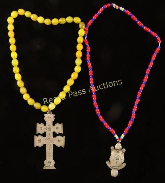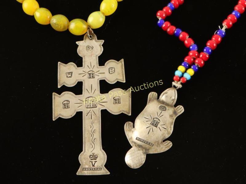 1 with a sterling beaver pendant stamped 'HB Montreal' with cobalt and red glass beads. 1 original Hudson Bay trade bead necklace with yellow grease beads with a sterling double cross pendant 'HB RG Montreal with a V and crown on top'.