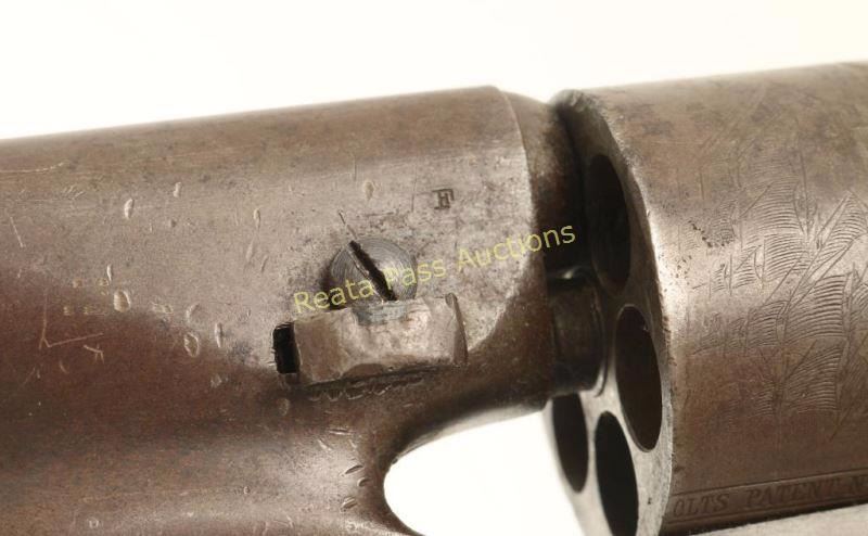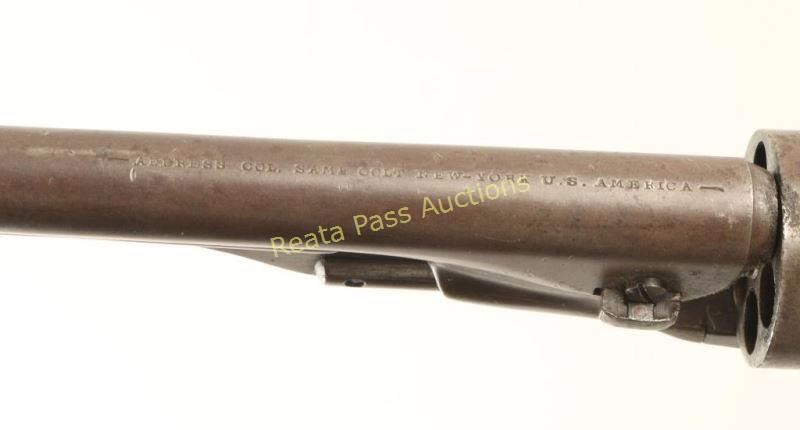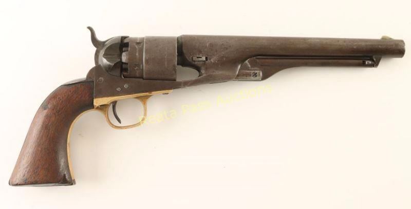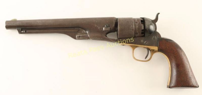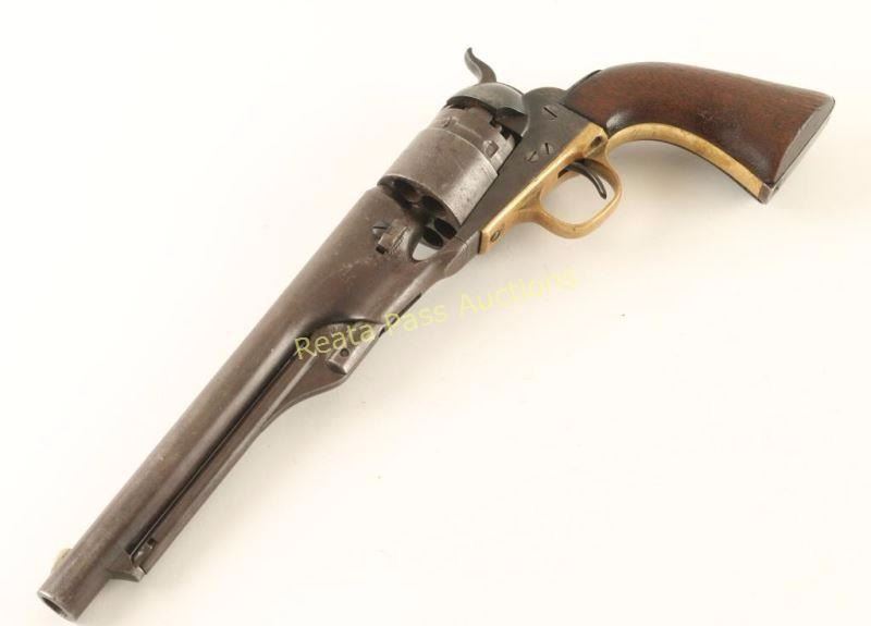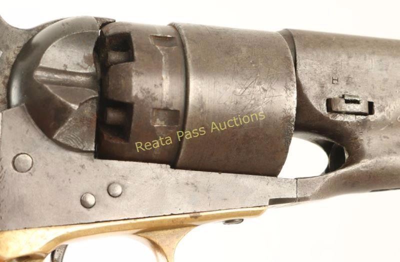 Martially marked & inspected single action percussion revolver issued to the Union Army during the civil war, circa 1863. Features an 8" barrel with "-ADDRESS COL. SAML COLT NEW-YORK U.S. AMERICA-" marking, blade front sight, notched rear sight, leading lever, non-fluted six shot cylinder with roll stamped naval engagement scene, brass triggerguard & front strap, checkered hammer spur, one-piece smooth walnut grips an illegible cartouche & a "W F & CO" stamp on the left side. Barrel address is crisp, patent markings are faint, cylinder scene is 86% intact and all serial numbers match. Inspector marks; "F" & "L" on the barrel, "CC" & "L" on cylinder, "W" on the front strap & " W" on the backstrap. Revolver retains small amounts of finish in some protected areas with the majority of the metal surfaces turned to a nice aged brown patina with very little pitting or rust. Action does not rotate the cylinder, bore is very good with some light old pitting and wood grips are near fine with some small losses. Condition is very good+. ***Modern Firearm***