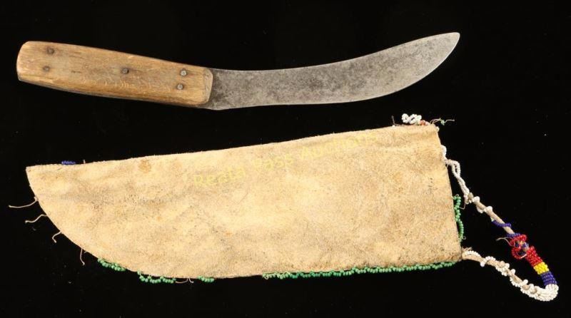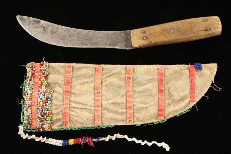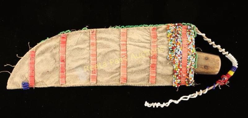Very old skinning knife with wood handle and curved blade measures 1 1/74" overall with a 5 5/8" blade. Includes a brain tanned leather scabbard accented with red striped quill work. Top of scabbard show rainbow glass trade beads and has a beaded handle which is detached from scabbard, is also accented with a green glass trade bead edge which shows scattered losses. Fair to good condition some losses.