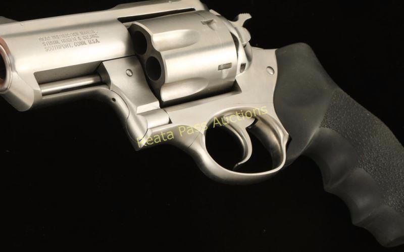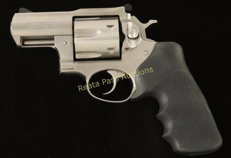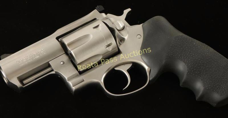 SN: 530-09995 Large frame stainless steel double action revolver chambered in .44 Magnum. Features a brushed finish, 2 1/2" barrel with solid top rib, ramped blade front sight, adjustable rear window sight with white outline, fluted six shot cylinder, smooth trigger, checkered hammer spur, and Hogue Tamer pebbled black rubber finger groove monogrip with Ruger logo. Revolver shows a dragline and a couple superficial scratches on the right side with no major wear observed. Action is smooth, bore is pristine and grip is fine. Condition is very good++. ***Modern Firearm***