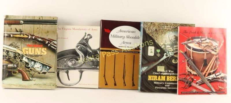 Including: "The Great Guns" by Harold L. Peterson and Robert Elman, "Civil War Chief of Sharpshooters Hiram Berdan Military Commander & Firearms Inventor" by Roy M. Marcot-signed by author, American Miliary Shoulder Arms" by George D. Moller-signed by author, and "The Virginia Manufactory of Arms" by Giles Cromwell.