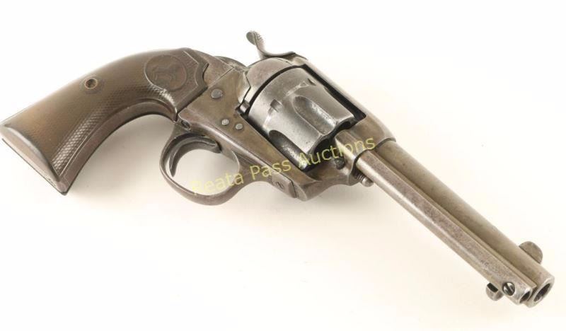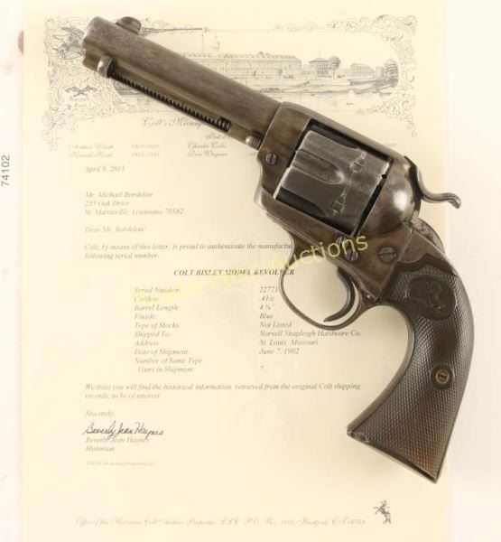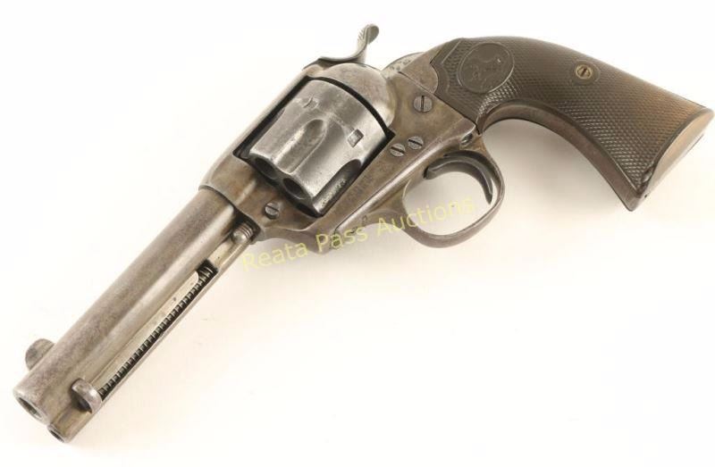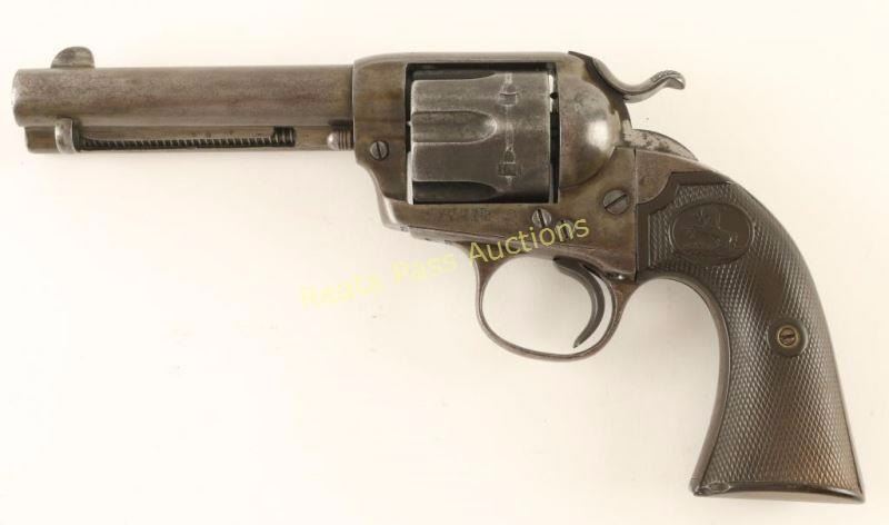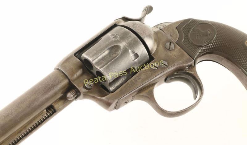 'First Generation' Single action six-shot revolver chambered in .41 Colt, circa 1902. Features a blued finish, 4 3/4" barrel with two line address, ejector rod, blade front sight, 'v' notched rear sight, wide low-profile hammer spur, smooth trigger, fluted cylinder, and two-piece Colt checkered black hard rubber grips. Includes a Colt factory letter which confirms it's configuration and states it was shipped to Norvell Shapleigh Hardware Co. of St. Louis, Missouri on June 7, 1902 in a seven gun shipment. Revolver exhibits no remaining original finish only varying tones of yellow, brown and grey with spots of light surface rust observed on the front sight & cylinder. Markings are faint and is some cases non existent but all serial numbers are intact and match. Action is crisp, bore is good with some pitting and grips are good with a small loss to the toe of the left panel. Condition is good. ***C&R Firearm*** ***Modern Firearm***