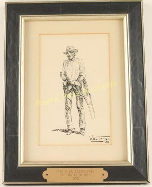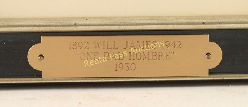 Entitled "One Bad Hombre" signed lower right. Single mat with black and silver edged wood frame with brass plaque that reads '1892 Will James 1942, "One Bad Hombre", 1930'. Image measures 4" x 6". Will James, cowboy, cattle rustler, and beloved author and artist of the American West was born in Quebec, Canada. He came West at the age of fifteen and became a cowhand showing artistic talent from an early age, gaining a reputation for his sketches of life on the range. Between 1920 and his death in 1942 Will James wrote and illustrated more than twenty books and numerous magazine articles. The Will James Society promotes his legacy, literature, and art, and donates his books to schools and libraries throughout the United States and Canada. They also send softcover versions to military installations in the US and overseas. The society is currently located in Elko, Nevada which is also the home of the Northeastern Nevada Museum, the home of Don Frazier's collection of art works and books by Will James. From the Bill A. Gary Estate Prescott, AZ.