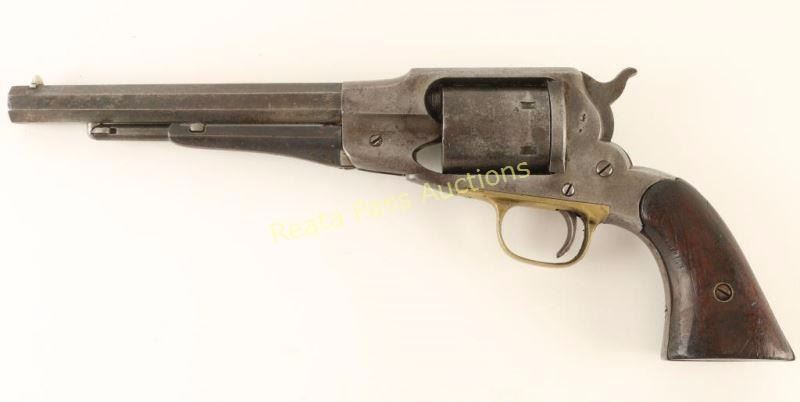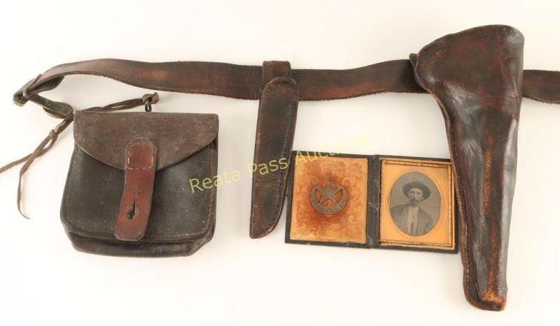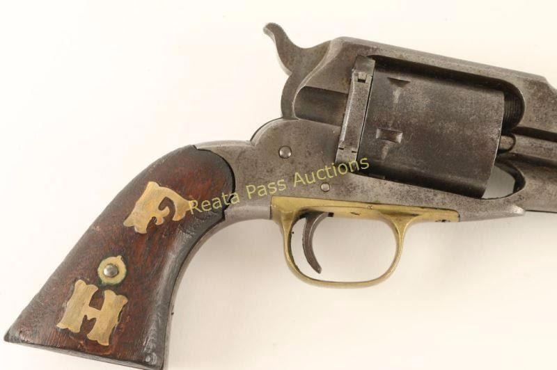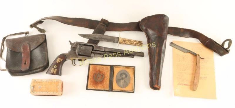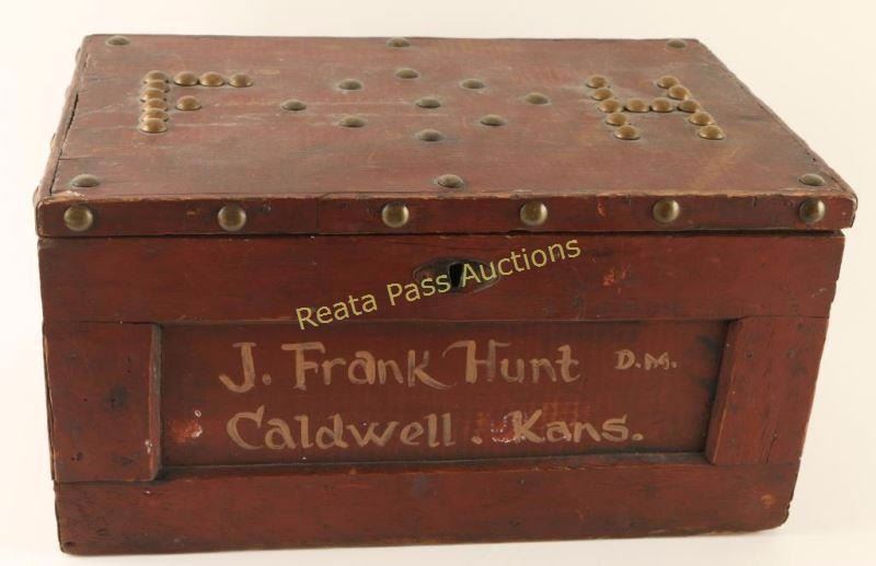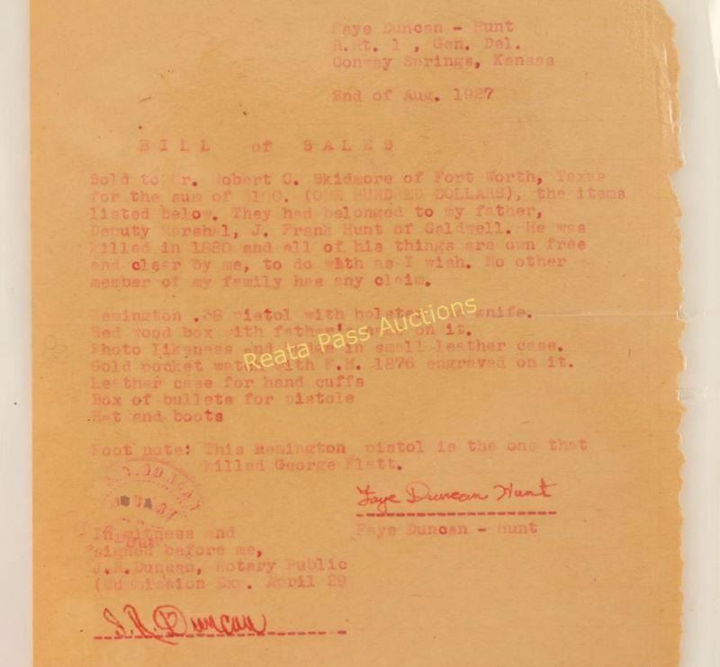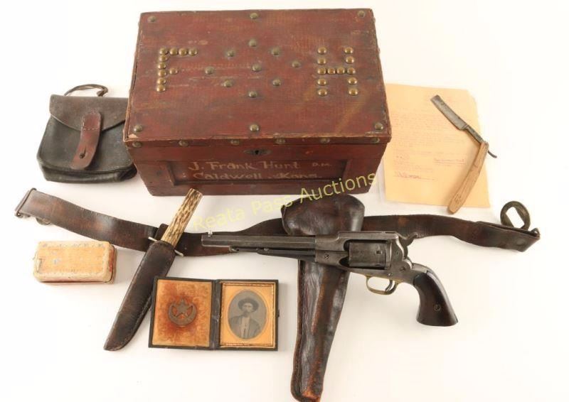 J. Frank Hunt was a well respected Cowley County Deputy Marshall& hardware merchant, who was assassinated in 1880. This collection of person items was sold by a family member with the following provenance: a typed document that reads "Faye Duncan - Hunt/R.Rt. 1 , Gen. Del./Conway Springs, Kansas/2nd of Au. 1927 BILL of SALES Sold to Mr. Robert C. Skidmore of Fort Worth, Texas for the sum of$100. (ONE HUNDRED DOLLARS), the items listed below. They has belonged to my father, Deputy Marshal, J. Frank Hunt of Caldwell. He was killed in 1880 and all of his things are own free and clear by me, to do with as I wish. No other member of my family has any claim. Remington .38 pistol with holter and knife. Red tool box with father's name on it. Photo likeness and badge in small leather case. Gold pocket watch with F.H. 1876 engraved on it. Leather case for hand cuffs Box of bullets for pistole Hat and Boots Foot note: This Remington pistol is the one that killed George Flatt." Signed by Faye Duncan - Hunt and notarized & signed by J. R. Duncan. The tool box described in the letter is a locking box of wood construction painted red with 'J. Frank Hunt D.M. Caldwell . Kans." painted on the front face in orange and is decorated with brass tacks with "F H" on the top lid. The photo likeness is cased tintype of the man with ornate bird scene on the outside with decorated plush interior which a star over crescent shaped bage that reads "DP. Marshal Caldwell". The box of bullets is a UMC cartridge box containing 49 rounds of .38 Long Rimfire. The leather case for hand cuffs is a smooth brown leather belt loop case with replaced front strap. The gold pocket watch mentioned is not present, and it it's place is a German made straight razor marked "The Prince". The Pistol is a Remington 1861 Army revolver #20486 which gas been converted to cartridge with serial number 734. Revolver is in good working order with approximately 10% finish intact with scattered pin prick pitting throughout, the grips are two-piec smooth walnut with an inlaid "F H" in brass letters on the right panel. The belt. holster & sheath are of smooth brown leather construction with no visible makers mark and a brass indian head clasp. The knife is a stag handled bowie marked "Joseph Allen & Sons Sheffield Englade" on the ricasso, "NON-XLL" on the left side of the blade and is etched 'J. Frank Hunt/Caldwell Kansas" on the right side on the blade. This a fantastic opportunity to own a piece of early American history.